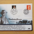 This 2001 Marconi radio transmission centenary crown coin first day cover commemorates Marconi's 100 years of the trans Atlantic transmission of wireless radio. The Benham FDC hosts a Marconi 1 crown coin and the PNC cover is signed by Charles Wheeler, a British broadcaster and journalist. Cancelled postmark Guglielmo Marconi Poldhu Point Helston 15-10-2001 and Canada Post St John's NF 12-12-2001.