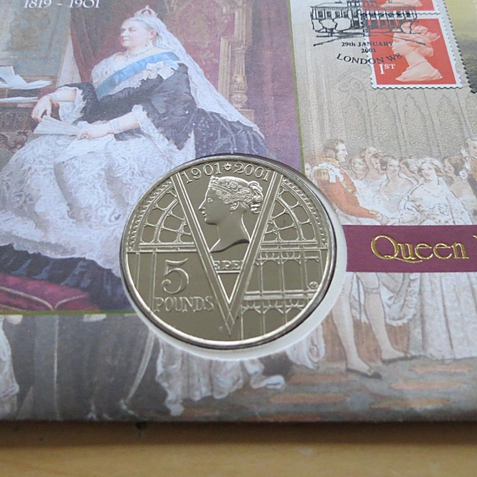 This 2001 Queen Victoria & The Victorian Age 5 pounds coin cover is a first day cover by Mercury Covers. It commemorates Queen Victoria's reign and hosts a brilliant uncirculated 5 pounds coin by the Royal Mint and a Royal Mail stamp stating Queen Victoria's lifespan 1819 - 1901. Cancelled postmark Kensington London W8 29th January 2001.