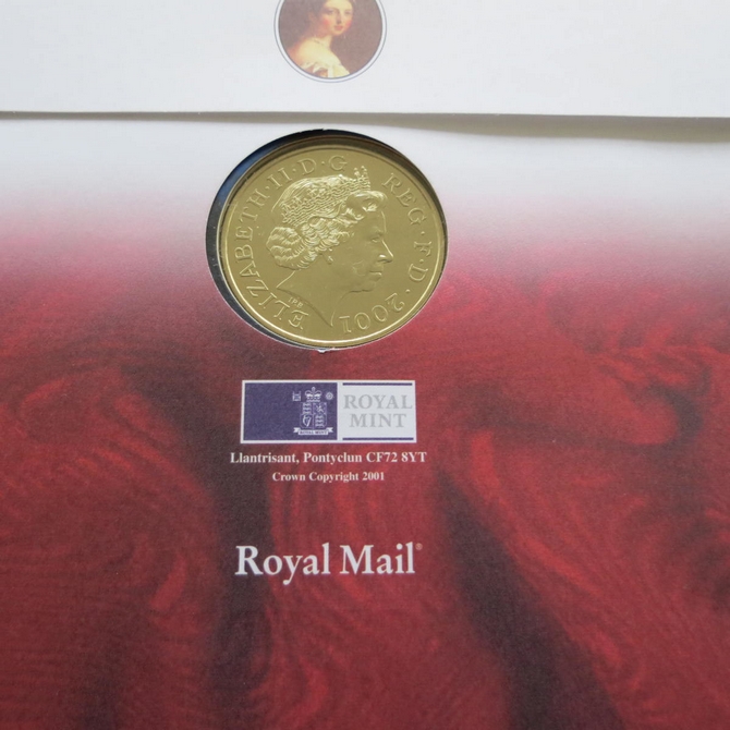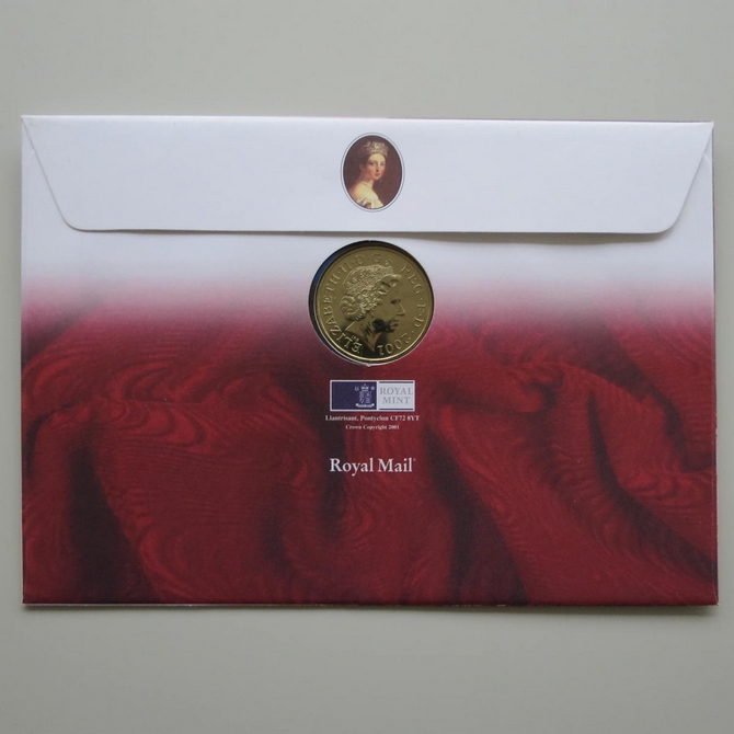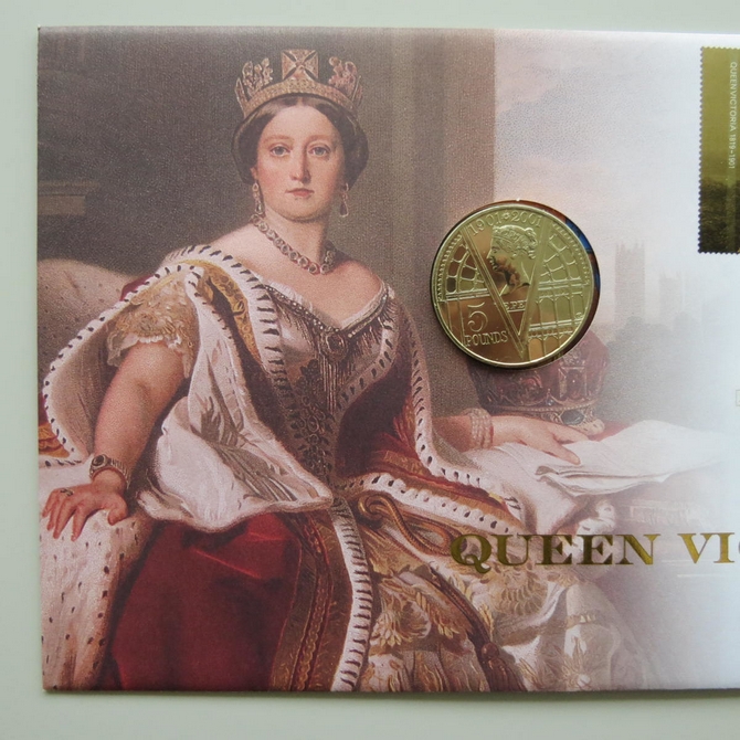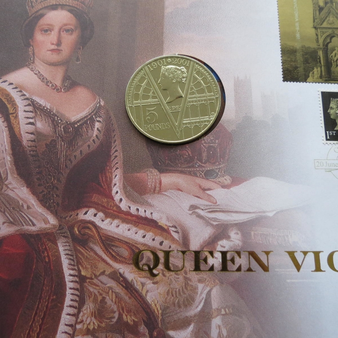 This 2001 Queen Victoria 5 pounds coin cover is issued in UK by Royal Mail as PNC first day covers. It commemorates the 100th death anniversary of Queen Victoria and hosts a brilliant uncirculated five pounds coin by the Royal Mint and a commemorative stamp depicting Queen Victoria and her lifespan. Cancelled postmark Cowes Isle of Wight Osbourne House 20th June 2001.