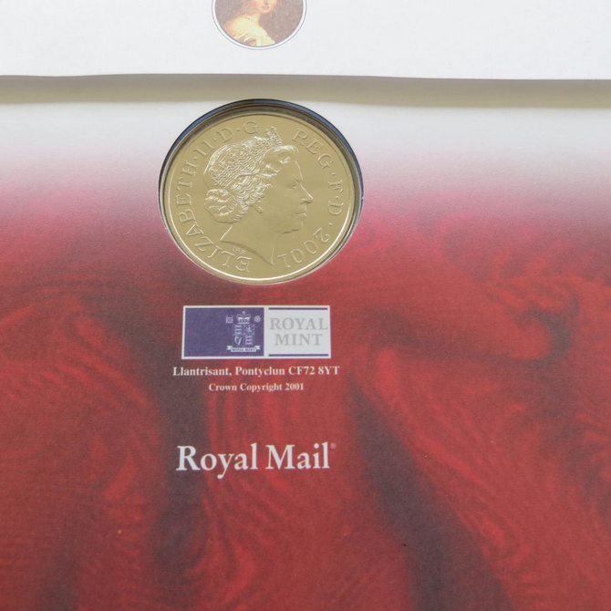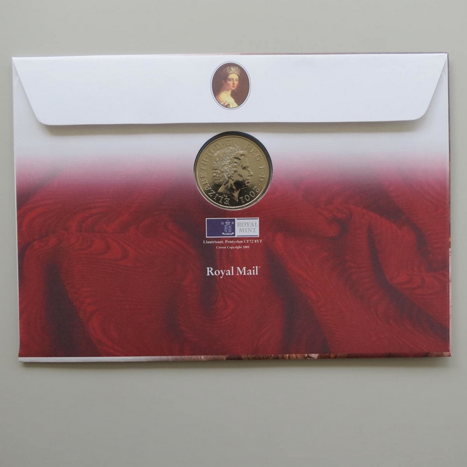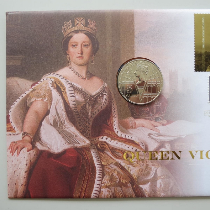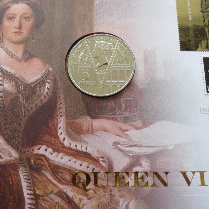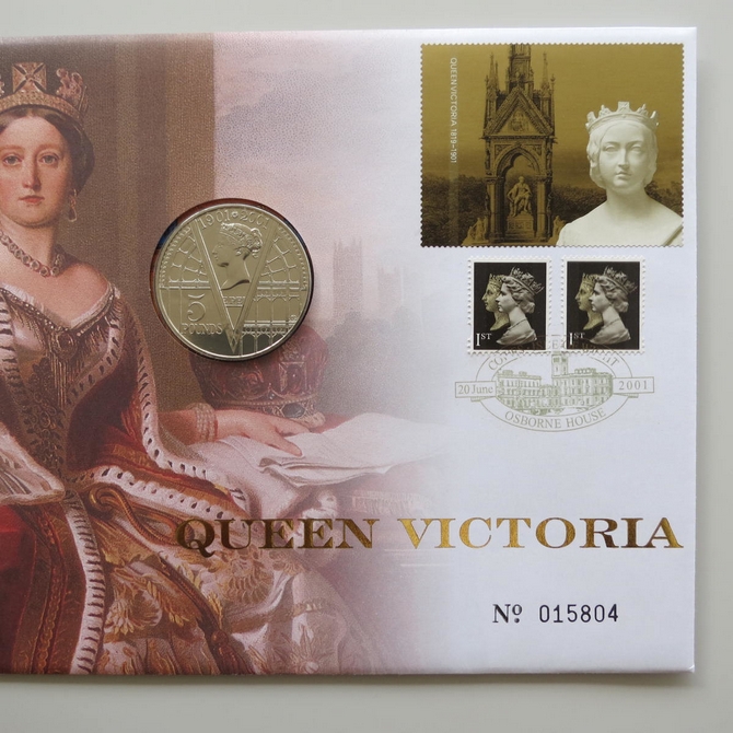 This 2001 Queen Victoria 5 pounds coin cover is issued in UK by Royal Mail as PNC first day covers. It commemorates the 100th death anniversary of Queen Victoria and hosts a brilliant uncirculated five pounds coin by the Royal Mint and a commemorative stamp depicting Queen Victoria and her lifespan. Cancelled postmark Cowes Isle of Wight Osbourne House 20th June 2001.