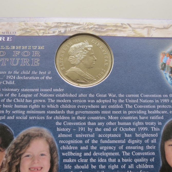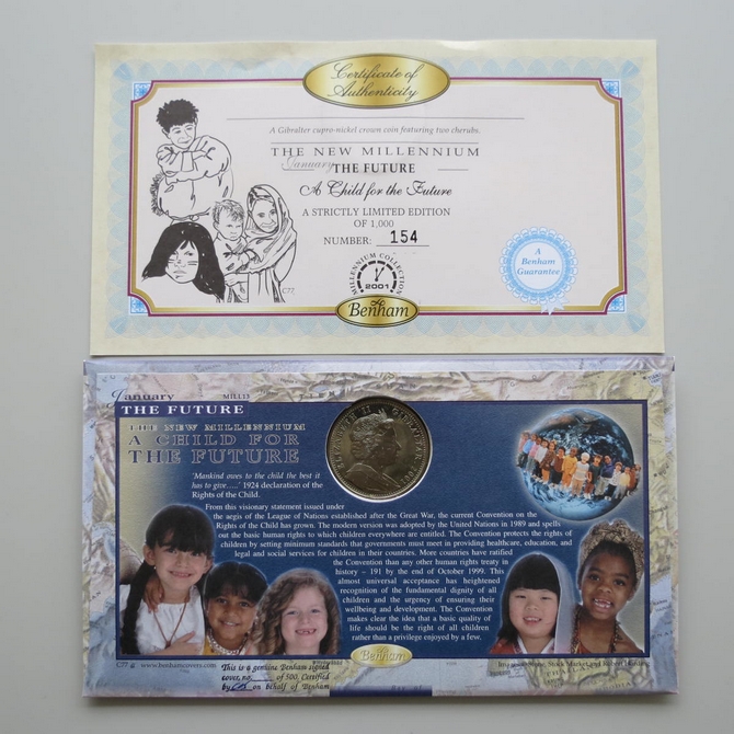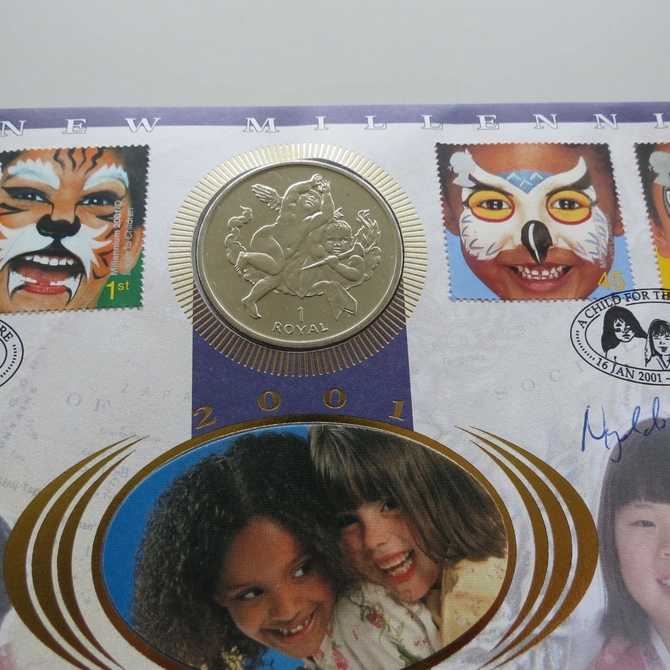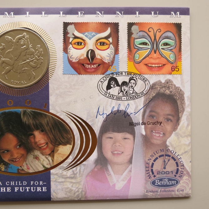 This 2001 The New Millennium The Future 1 Royal first day coin cover is a signed Benham FDC. Cover named A child for the Future, it celebrates the new millennium and hosts a brilliant uncirculated Gibraltar 1 Royal coin and Royal Mail stamps. The cover is hand signed by Nigel de Grunchy. Postmark cancelled A Child for the Future London NI 16th January 2001.