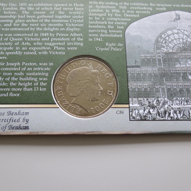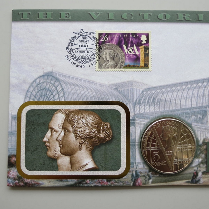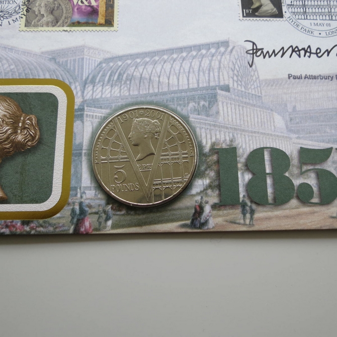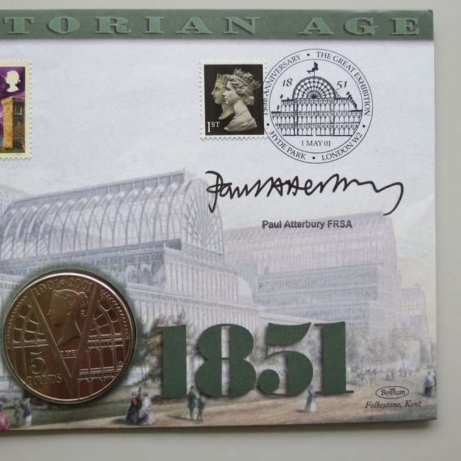 This 2001 Victorian Age 5 pounds coin cover is a Benham first day cover. It commemorates the great Victorian Age Exhibition of 185 and hosts a brilliant uncirculated 5 pounds coin by the Royal Mint depicting Queen Victoria and stamps. The cover is hand signed by Paul Atterbury FRSA. Cancelled postmark The Great 1851 Exhibition Isle of Man and 150th Anniversary The Great Exhibition Hyde Park London W2 1st May 2001.