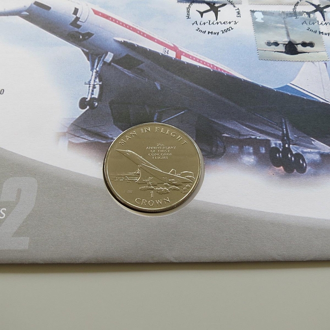 This 2002 Airliners 1 crown coin cover is issued by Westminster Collection as UK first day covers. It commemorates all the renowned airliners and hosts a brilliant uncirculated Isle of Man one crown coin and Royal Mail stamps. The coin features Concorde with inscription Man in Flight 25th Anniversary of First Concorde Flight. Stamp cancelled postmark Airliners Heathrow Airport Hounslow TW5 2nd May 2002.
