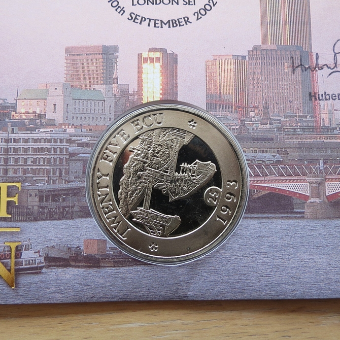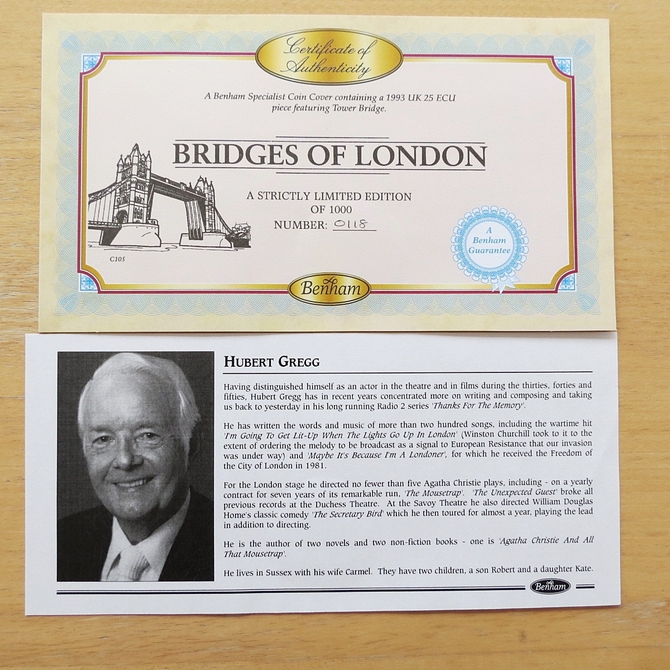 This 2002 Bridges of London 25 ECU coin cover celebrates London's renown bridges. The Benham first day cover hosts a 25 ECU coin depicting Tower Bridge of London. The FDC is hand signed by Hubert Gregg, an actor, author and song writer. Cancelled postmark London Bridges Tower Bridge London SE1 10th September 2002.