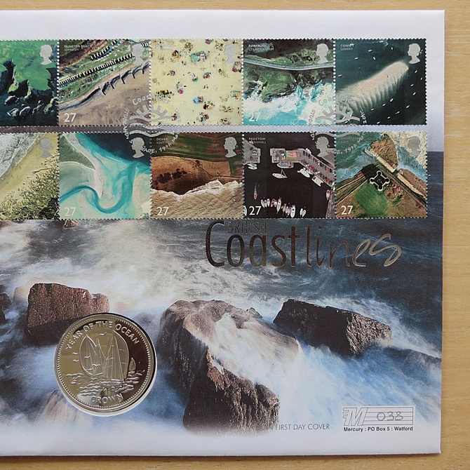 This 2002 British Coastlines silver 1 crown coin cover is a UK first day cover. It celebrates the varied British coastline and hosts a Isle of Man silver 1 crown coin and Royal Mail stamps. The coin features sailing boats and the cover houses ten stamps from the Coastlines series. Cancelled postmark Coastlines Studland Swanage 19th March 2002.