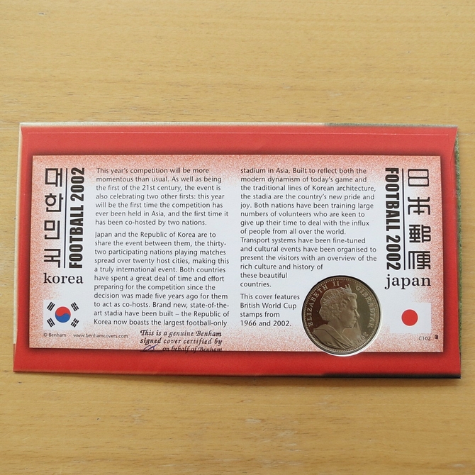 This 2002 Football World Cup 1 crown coin cover is a Benham first day cover. It celebrates the 2002 FIFA World Cup football championship and hosts a brilliant uncirculated one crown coin and Royal Mail stamps. FDC hand signed by Peter Bonetti, a professional football player. A stamp cachet features England's St Georges flag and includes England Winners World Cup 1966 stamp. Cancelled postmark Football 2002 Wembley 21st May 2002.