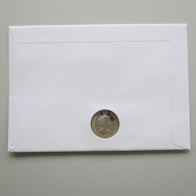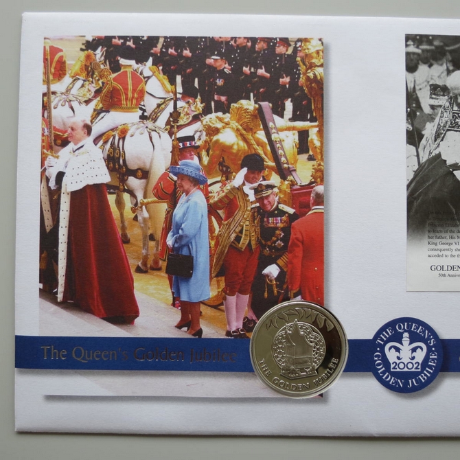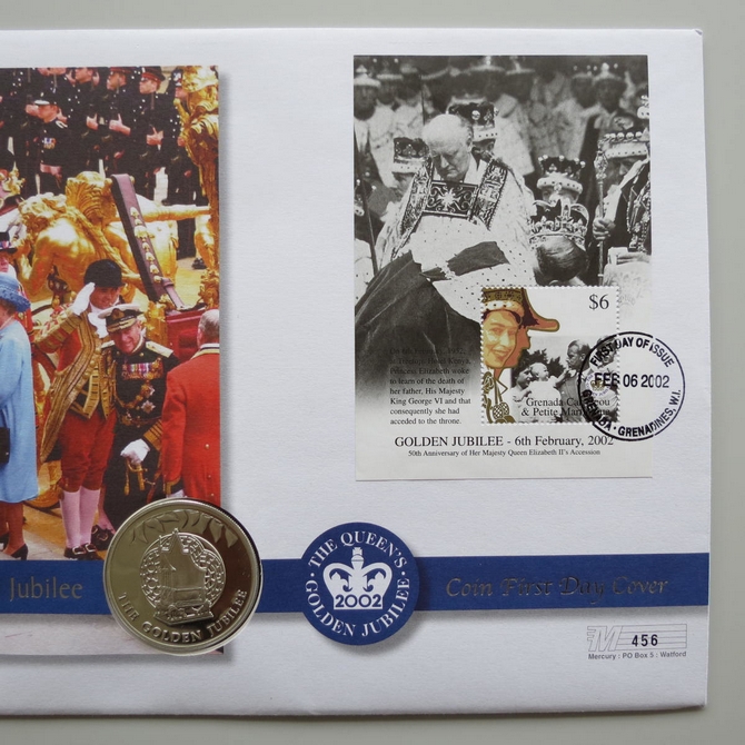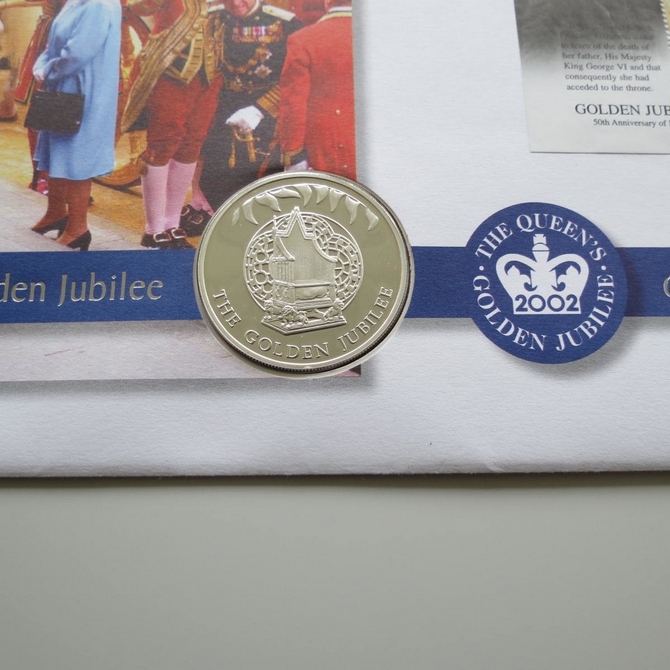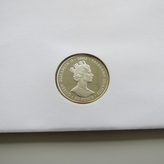 This 2002 Golden Jubilee of The Queen silver proof 50p pence coin cover is issued by Grenada as PNC first day covers. It hosts a silver fifty pence coin by Falkland Islands and stamps celebrating 50 years of Her Majesty's Jubilee. Cancelled postmark 6th February 2002.