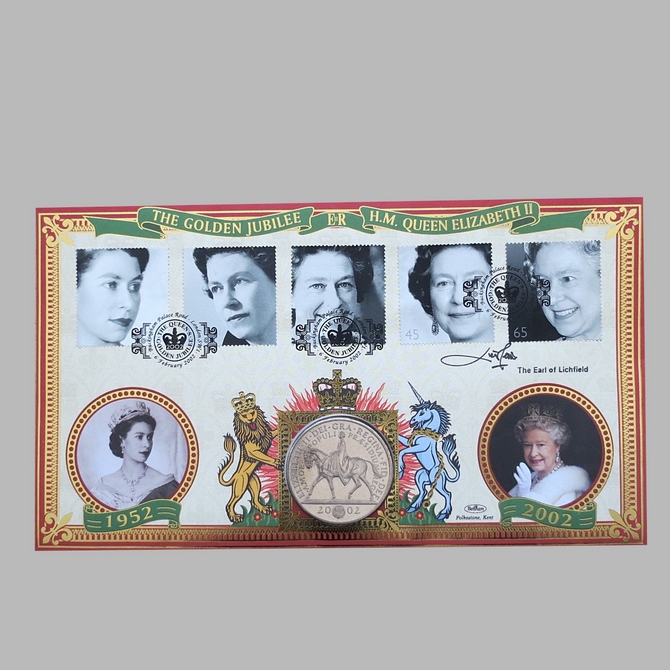 This 2002 HM Queen Elizabeth II Golden Jubilee 5 pounds coin cover is a Benham first day cover. It commemorates the Golden Jubilee of Her Majesty Queen Elizabeth II and hosts a five pounds coin and Royal Mail stamps showing portraits of Her Majesty through the ages. FDC hand signed by The Earl of Lichfield, cousin to HM The Queen and Royal photographer. Cancelled postmark The Queen's Golden Jubilee Buckingham Palace Road London SW1 6th February 2002.