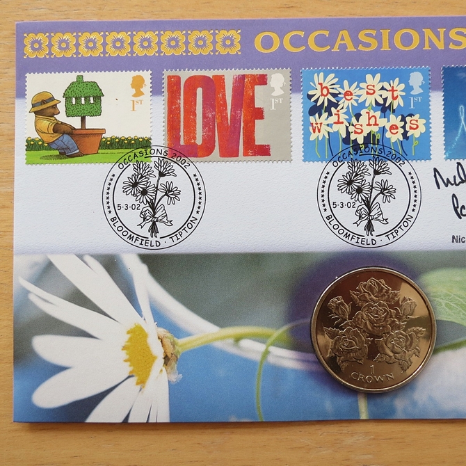 This 2002 Occasions 1 crown coin cover is a Benham first day cover. It encapsulates the many occasions we celebrate in our lives and hosts a brilliant uncirculated Gibraltar one crown coin and Royal Mail stamps. FDC hand signed by Nicola Pagett, a British Actress. Cancelled postmark Occasions 2002 Bloomfield Tipton 5th March 2002.