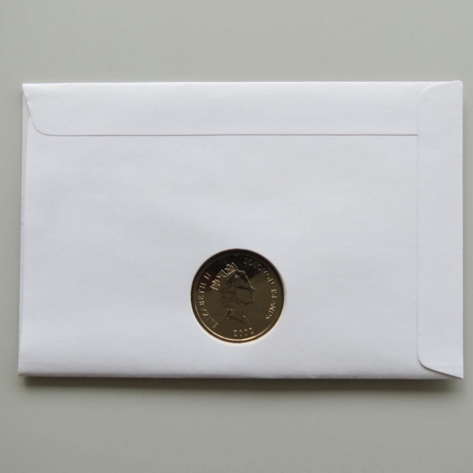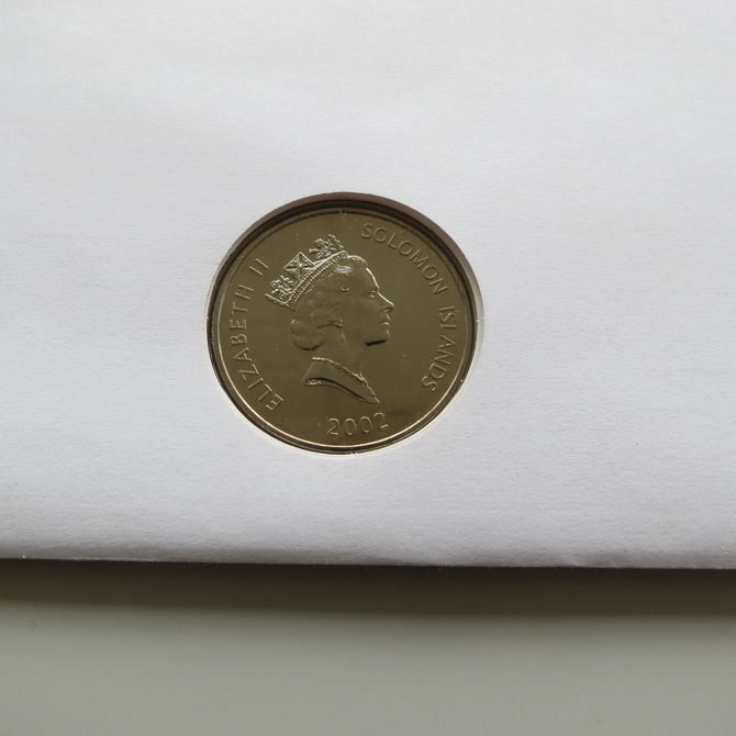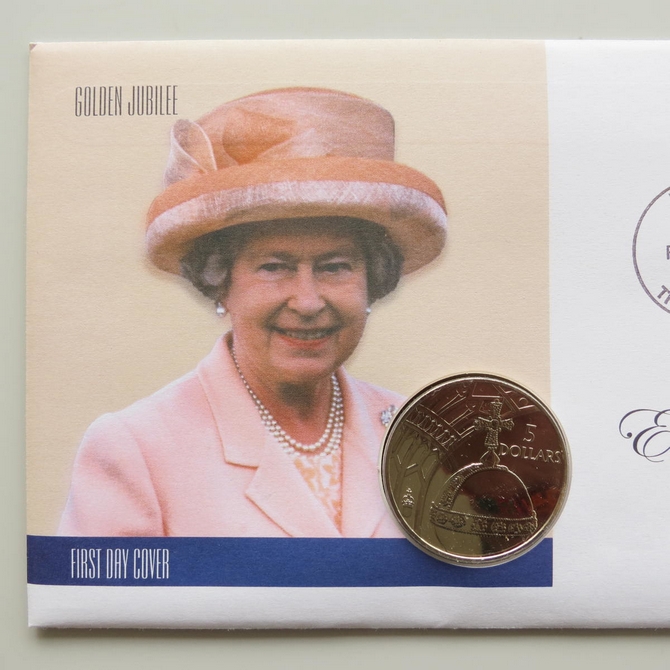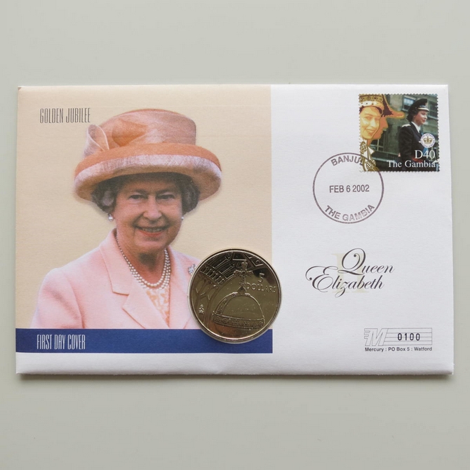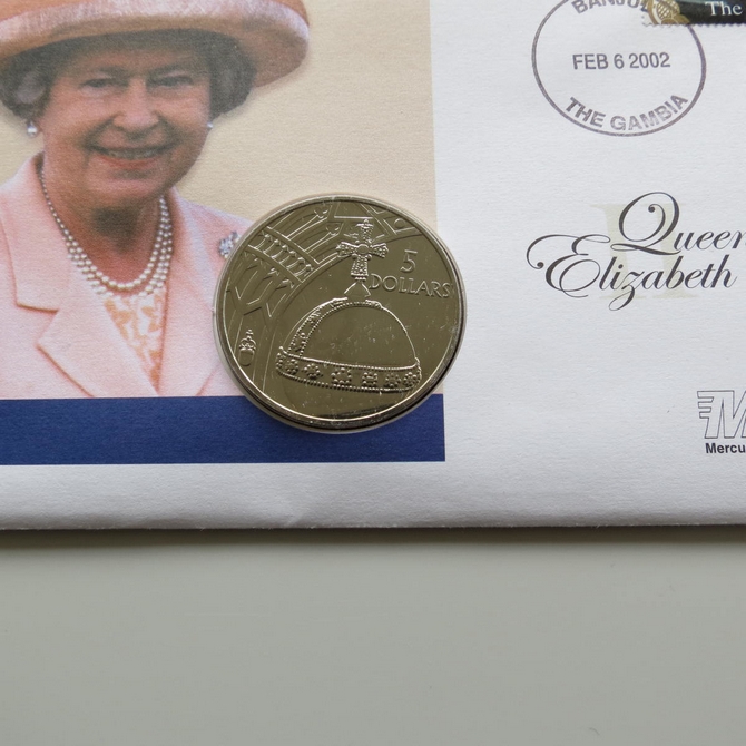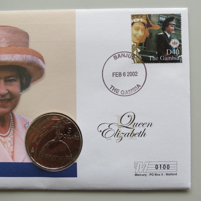 This 2002 Queen's Golden Jubilee 5 dollar coin cover is issued by The Gambia as PNC First Day Covers. It hosts a brilliant uncirculated five dollars coin by Solomon Islands and a stamp. Commemorates HM Queen Elizabeth II's 50 year Jubilee. Postmark cancelled dated 6th February 2002.