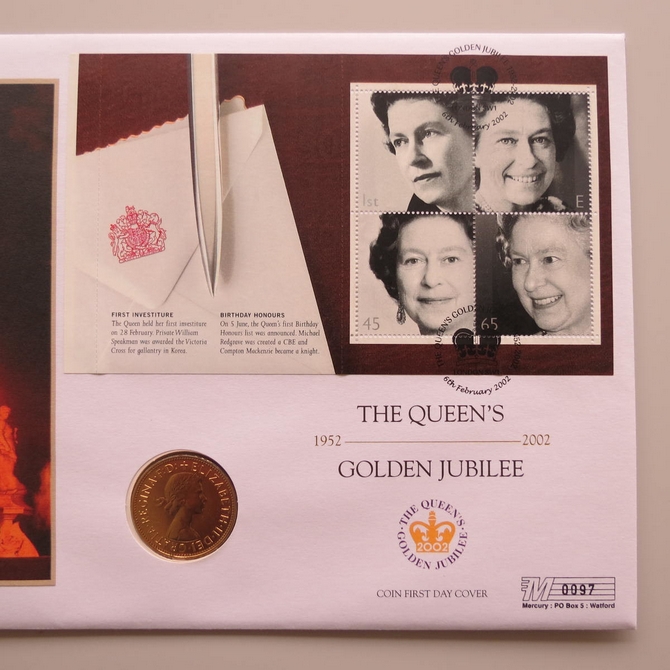 This 2002 Queen Elizabeth II Golden Jubilee one penny coin cover is issued by UK as PNC First Day Covers. It hosts a 1967 1 penny coin and Royal Mail stamps commemorating Her Majesty's 50 year Jubilee. Cancelled postmark dated 6th February 2002.