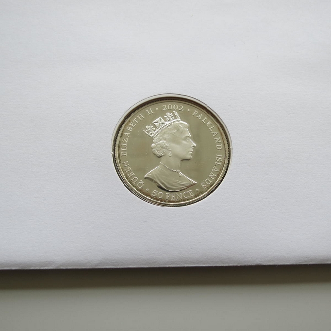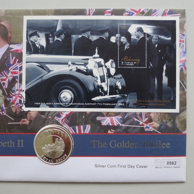 This 2002 Queen Elizabeth II Golden Jubilee silver 50p pence coin cover is issued by Alderney as PNC first day covers. It hosts a silver proof fifty pence coin by Falkland Islands and a stamp commemorating the 50 years of The Queen's Jubilee. Cancelled postmark Guernsey Post Office 6th February 2002.