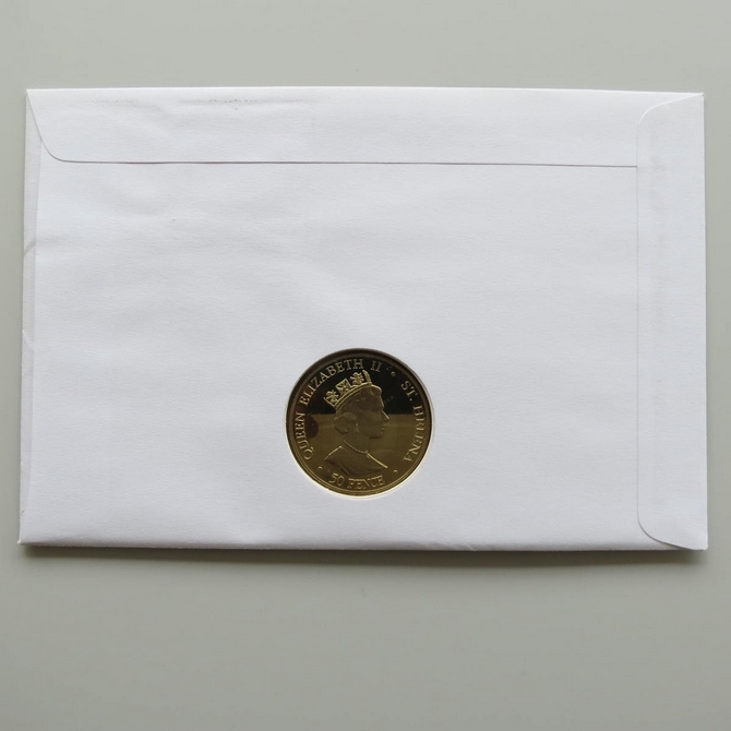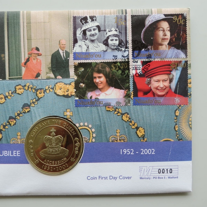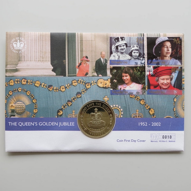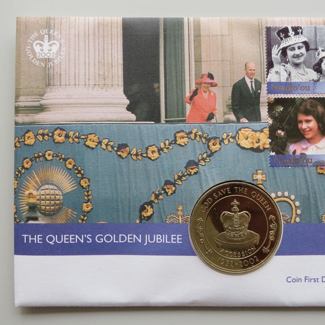 This 2002 The Queen's Golden Jubilee 50p pence coin cover is issued by Niuafo'ou as PNC First Day Covers. It hosts a brilliant uncirculated fifty pence coin by St Helena and 4 stamps. Commemorates the 50 year Jubilee of Her Majesty Queen Elizabeth II. Postmark cancelled dated 6th February 2002.