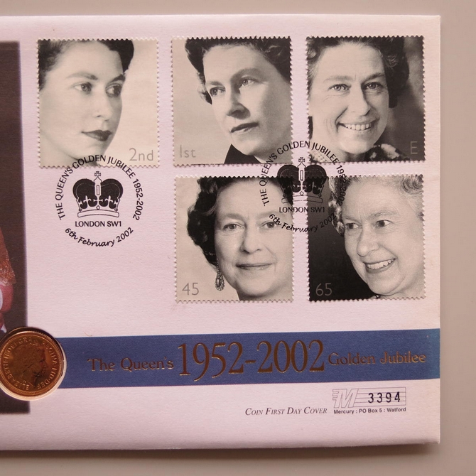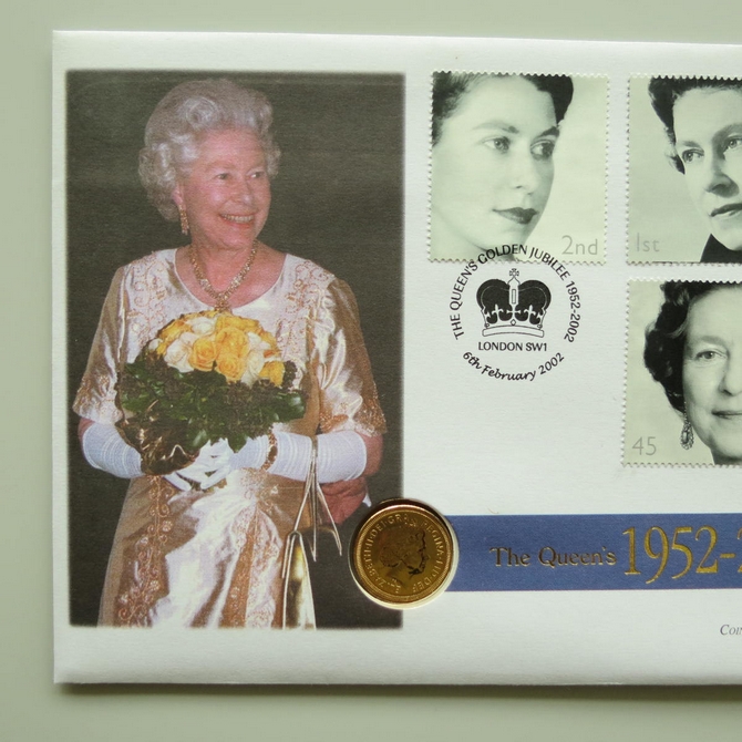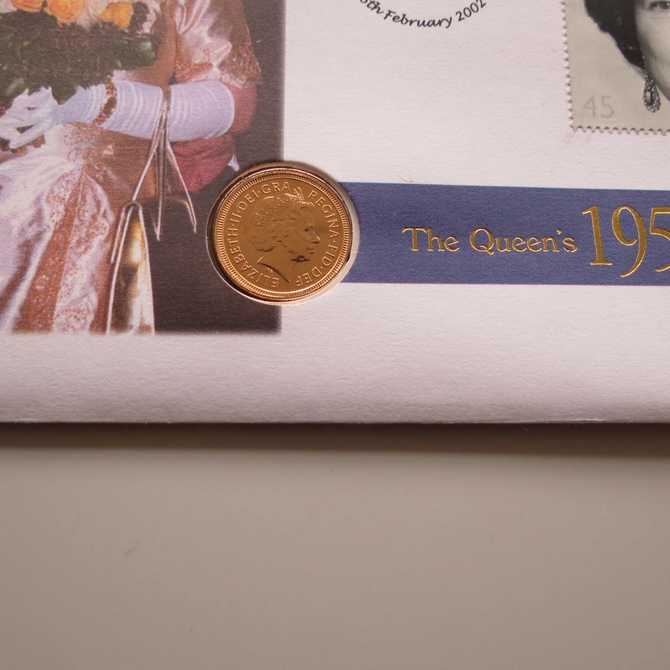 This 2002 The Golden Jubilee Gold half sovereign coin cover is issued by UK as PNC First Day Covers. It hosts a 22carat gold half sovereign issued by the Royal Mint and Royal Mail stamps. Postmark cancelled dated 6th February 2002.