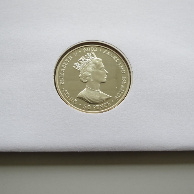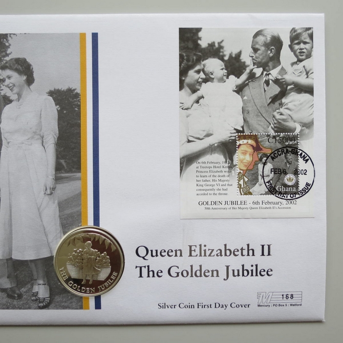 This 2002 The Golden Jubilee Queen Elizabeth II silver proof 50p coin cover is a Ghana first day cover. It marks Hm Queen Elizabeth II's Golden Jubilee and hosts a silver proof 50p pence coin by Falkland Islands and a Ghana stamp. Cancelled postmark First Day of Issue Accra Ghana 6th February 2002.