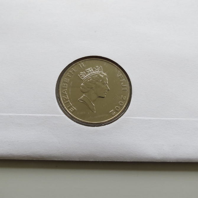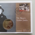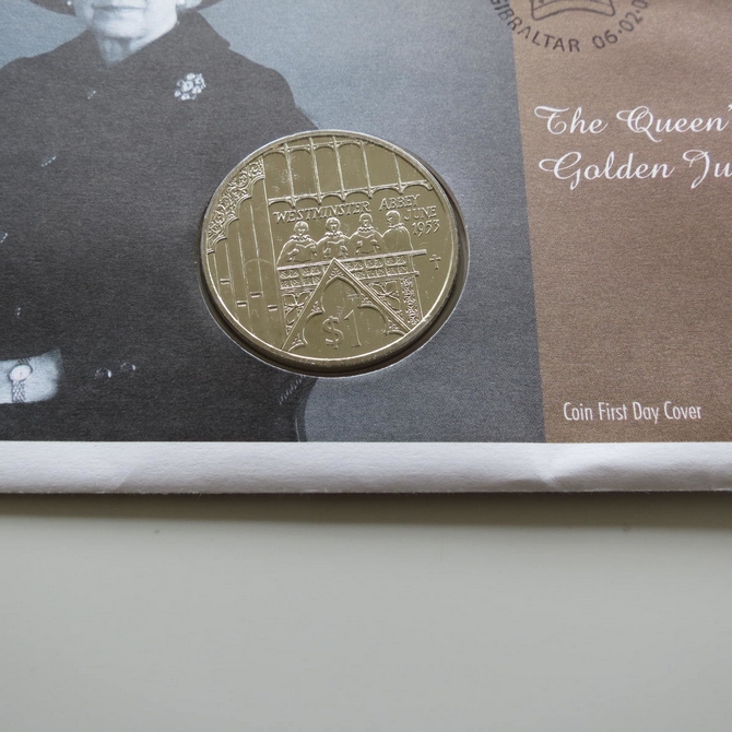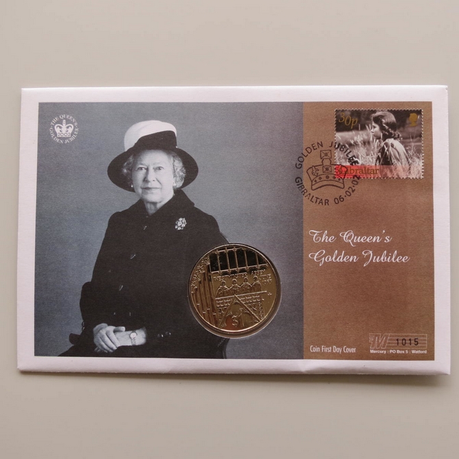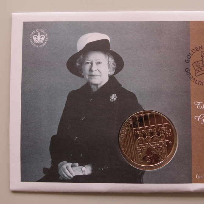 This 2002 The Queen's Golden Jubilee 1 dollar coin cover is a Gibraltar First Day Cover by Mercury. It commemorates the Golden Jubilee of HM Queen Elizabeth II and hosts a 1 dollar coin and Gibraltar stamp. The brilliant uncirculated Fiji coin features reading at Westminster Abbey and the stamp depicts Her Majesty as a young Princess. Cancelled postmark Golden Jubilee Gibraltar 6th February 2002.