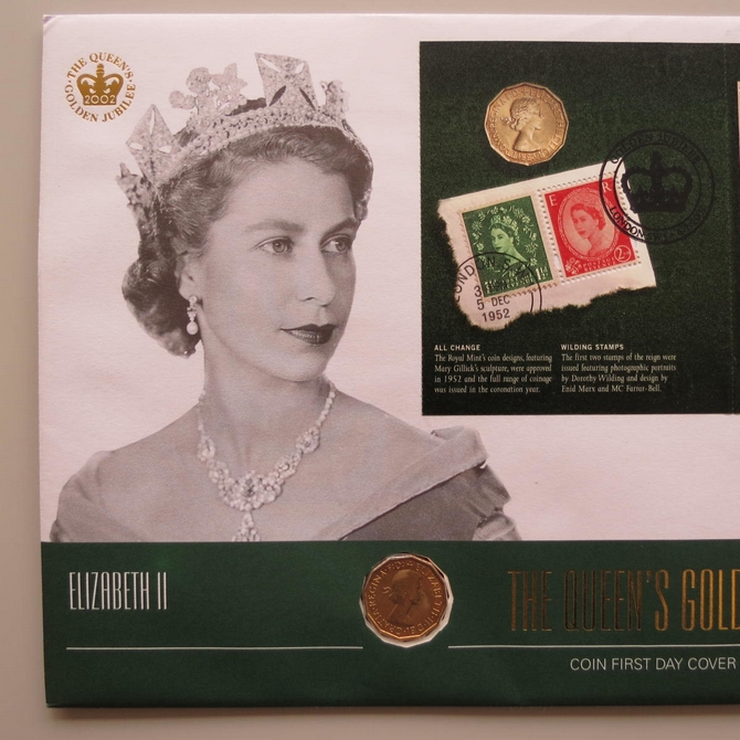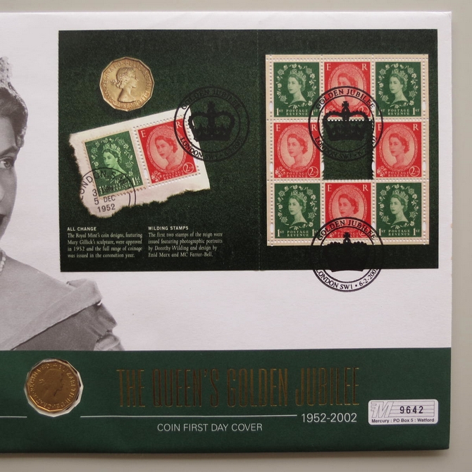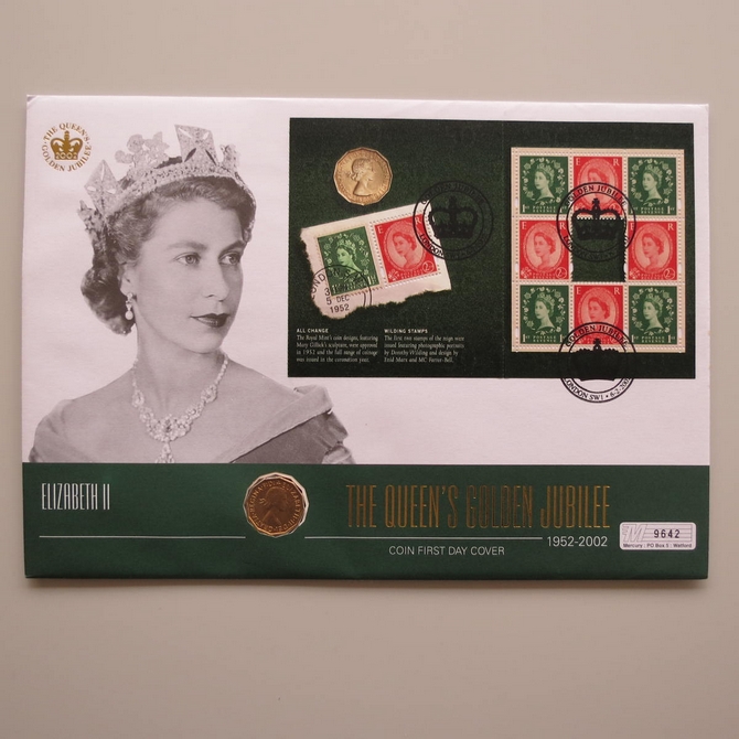 This 2002 The Queen's Golden Jubilee three pence coin cover is issued by the UK as PNC first day covers. It hosts a 1967 3p pence coin and Royal Mail Wilding stamps celebrating Her Majesty Queen Elizabeth II's 50 year Jubilee. Postmark cancelled Golden Jubilee London SW1 6th February 2002.