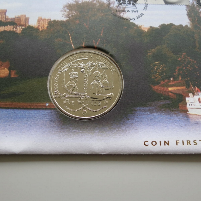 Queen Elizabeth II Golden Jubilee BU 5 Pounds Coin Cover