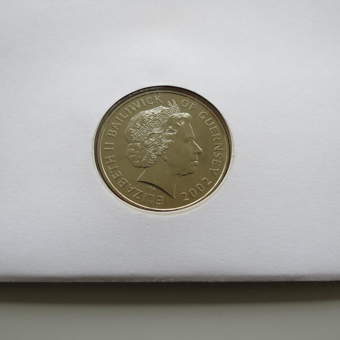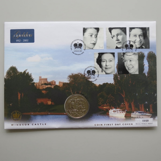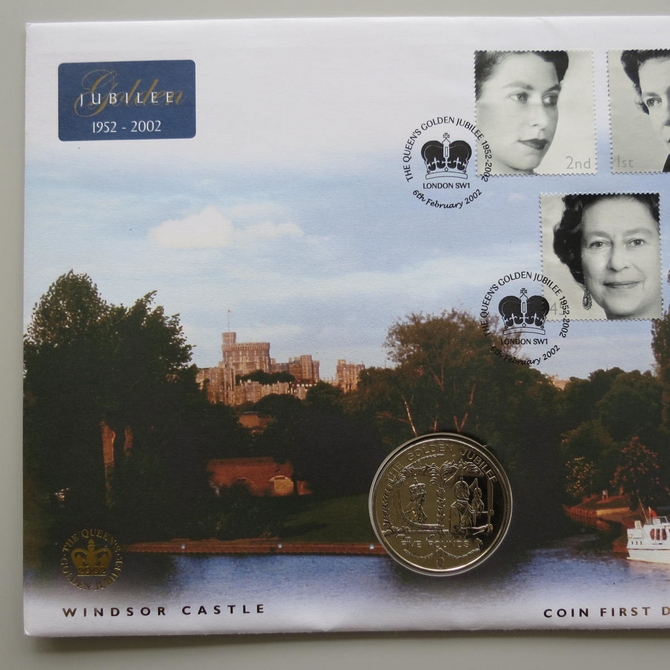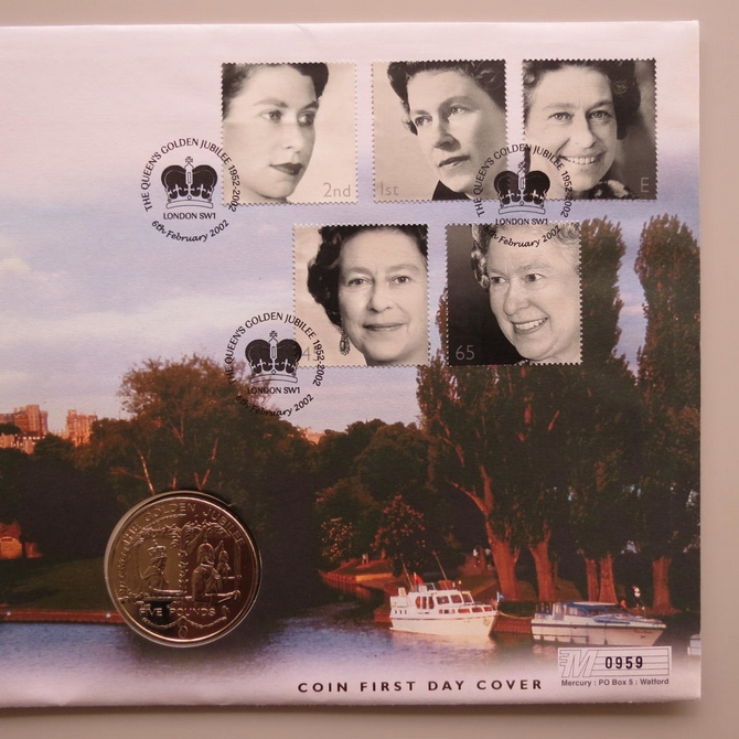 This 2002 Queen Elizabeth II Golden Jubilee BU 5 pounds coin cover is issued by UK as PNC first day covers. It hosts a brilliant uncirculated five pounds coin by Guernsey and Royal Mail stamps marking 50 years of Her Majesty's Jubilee. Cancelled postmark The Queen's Golden Jubilee 1952 - 2002 London SW1 6th February 2002.