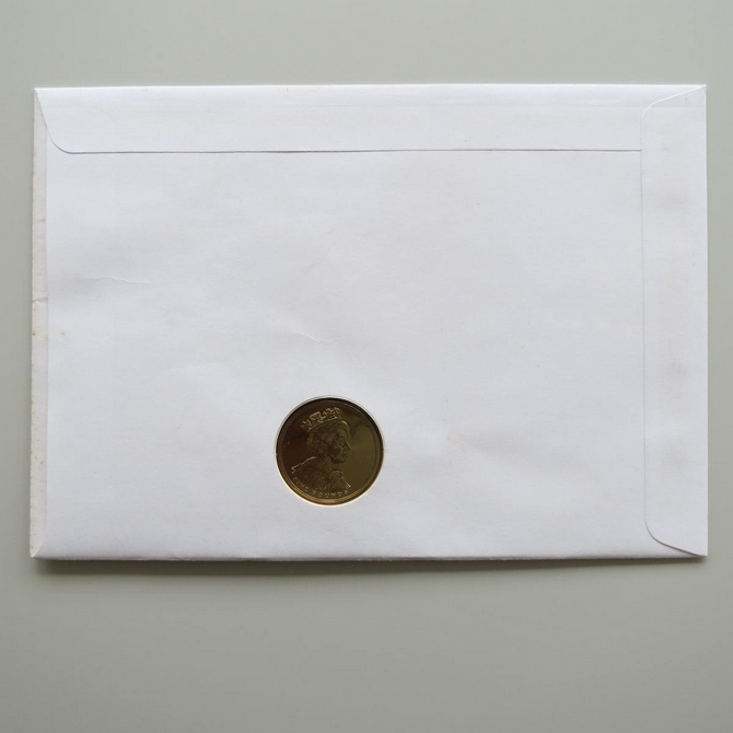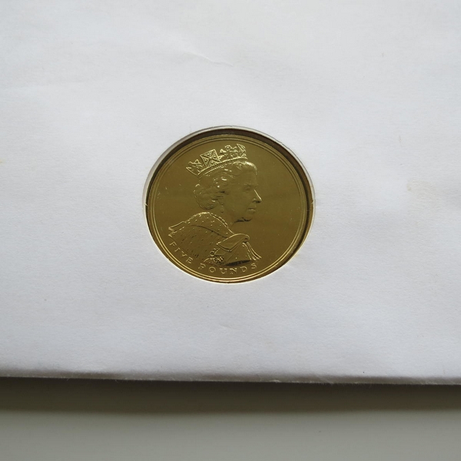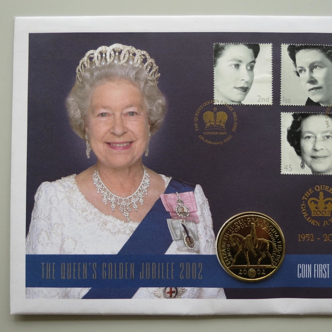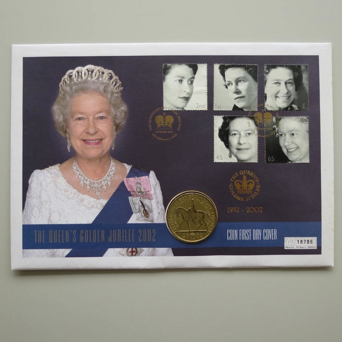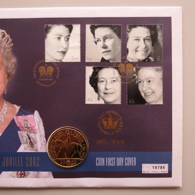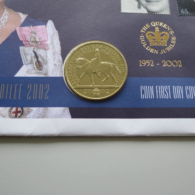 This 2002 Queen's Golden Jubilee BU 5 pounds coin cover is issued in UK as PNC first day covers. It hosts a brilliant uncirculated five pounds coin by the Royal Mint and Royal Mail stamps celebrating the 50 year Jubilee of Her Majesty Queen Elizabeth II. Cancelled in 22 carat gold foil postmark The Queen's Golden Jubilee 1952 - 2002 London SW1 6th February 2002.