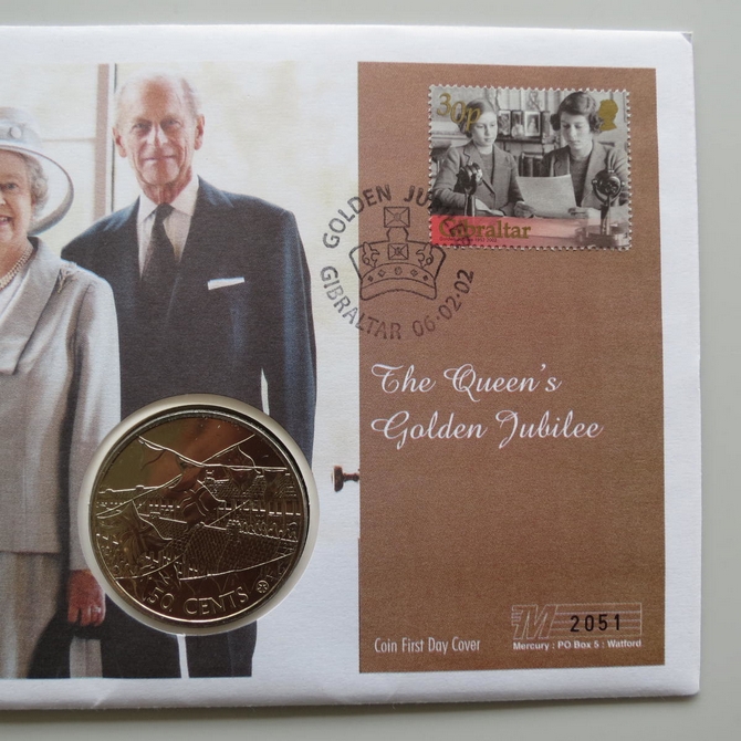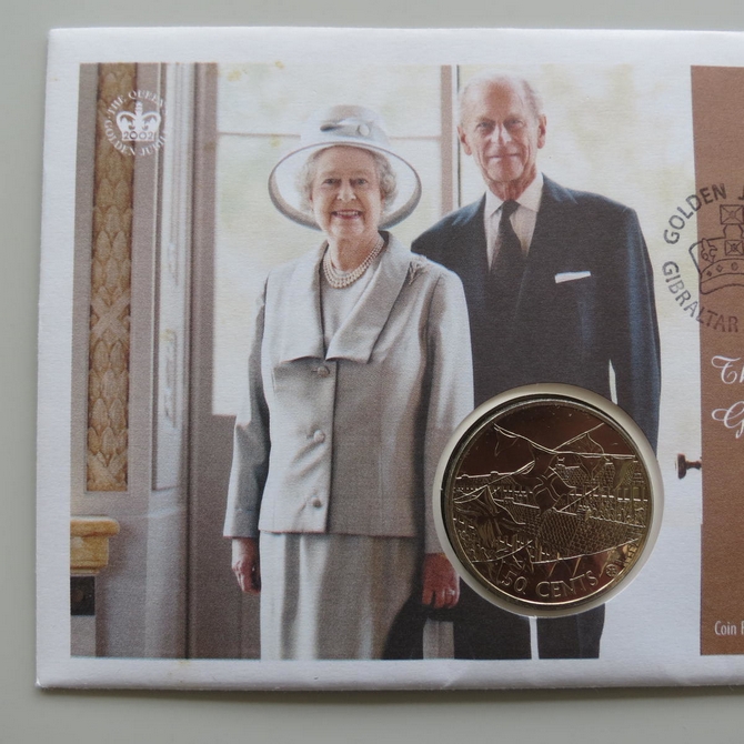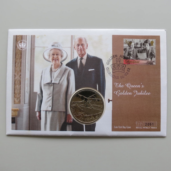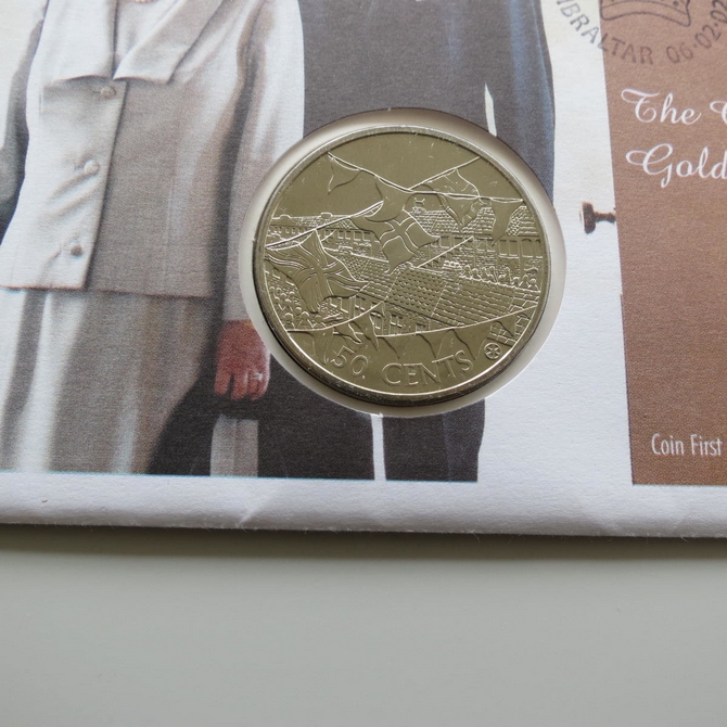 This 2002 The Queen's Golden Jubilee 50c cents coin cover is issued by Gibraltar as PNC first day covers. It hosts a brilliant uncirculated fifty cent coin and a Gibraltar stamp. Marks the 50 years of HM Queen Elizabeth II's accession to the throne. Cancelled postmark Golden Jubilee Gibraltar 6th February 2002.