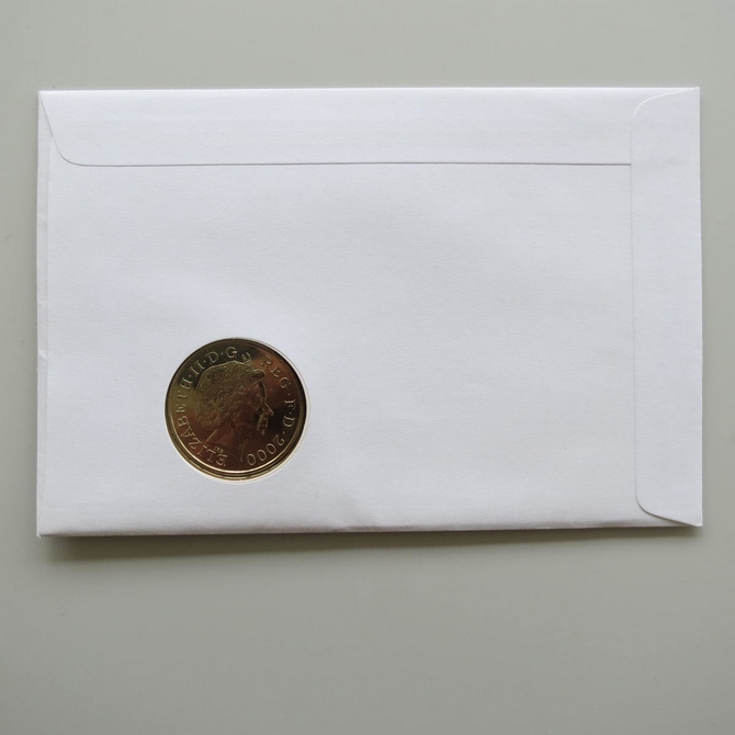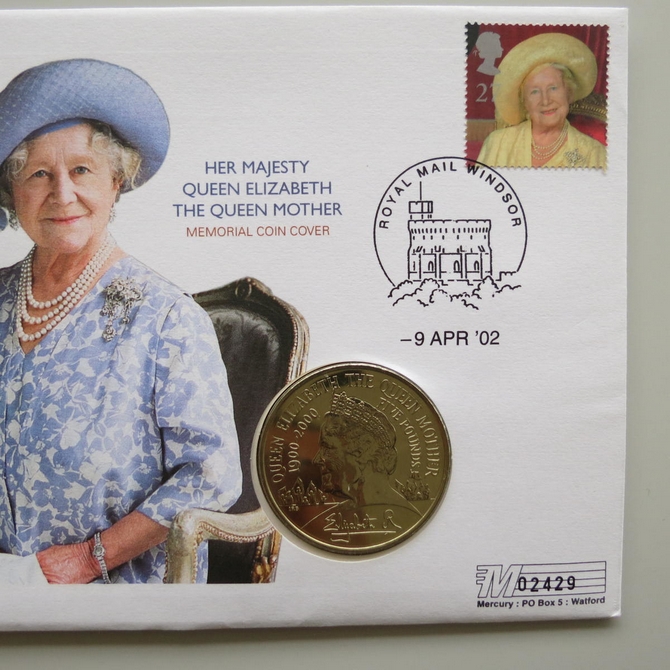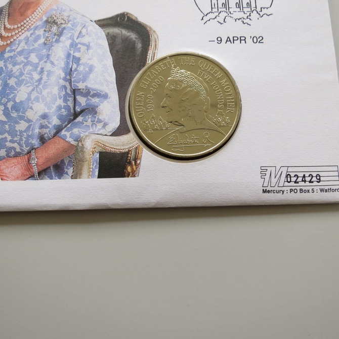 This 2002 The Queen Mother memorial 5 pounds coin cover is issued in UK as PNC First Day Covers. It hosts a brilliant uncirculated five pounds coin featuring Her Majesty Queen Elizabeth The Queen Mother and a Royal Mail stamp. Postmark cancelled dated 9th April 2002.