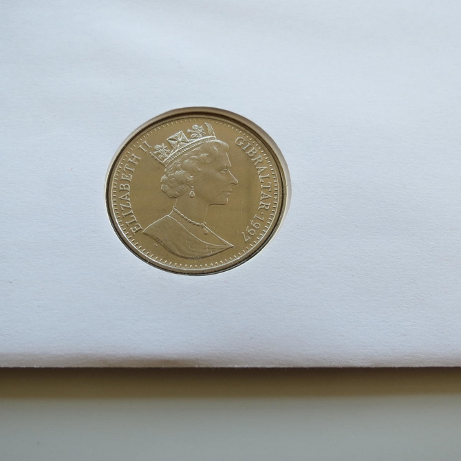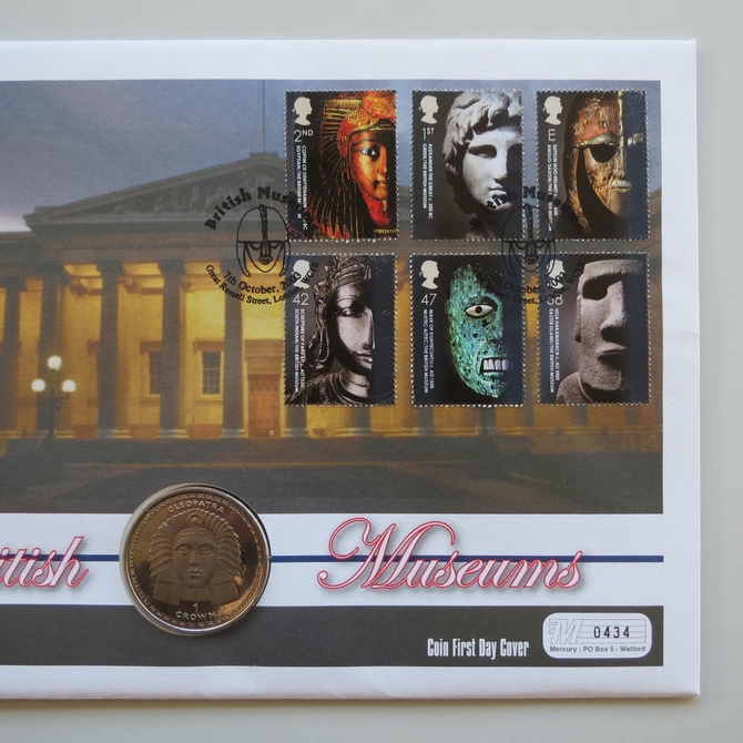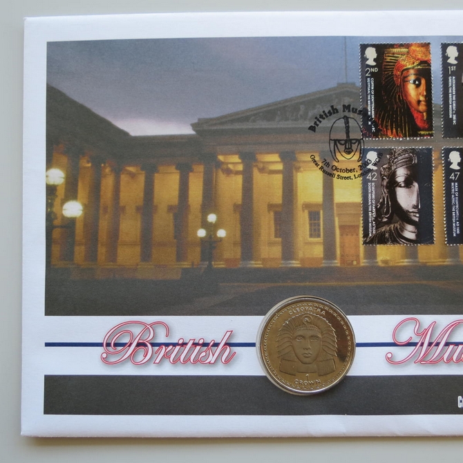 This 2003 British Museum Gibraltar 1 crown coin cover is issued in UK as first day covers. It hosts a Gibraltar brilliant uncirculated one crown coin depicting Cleopatra and Royal Mail stamps all celebrating the Museum's ancient artefacts. Postmark cancelled British Museums Great Russell Street London WC1E.