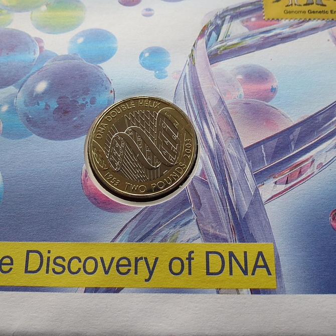 This 2003 Discovery of DNA 50th anniversary 2 pounds coin cover is a first day cover by Mercury Covers. It celebrates the 50th anniversary of DNA discovery and hosts a two pounds coin by the Royal Mint and Royal Mail stamps. The brilliant uncirculated coin features the DNA spiralling double helix and Secret of Life stamps. Postmark cancelled The Secret of Life Cambridge 25th February 2003.