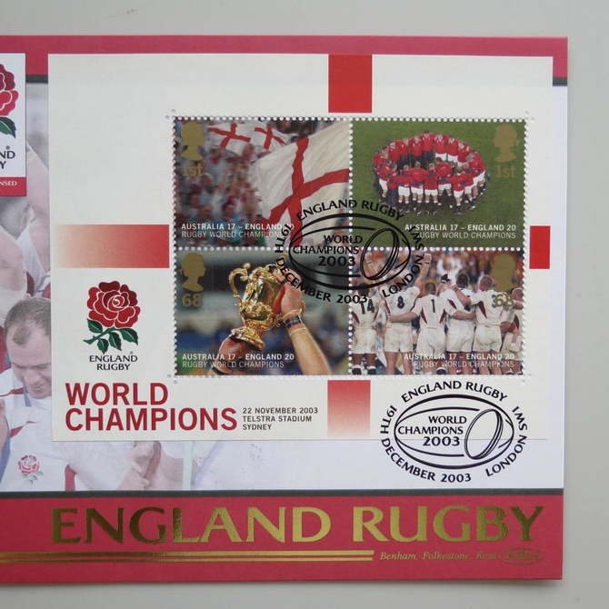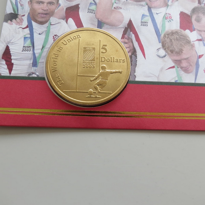 This 2003 England Rugby World Champions 5 dollar coin cover is issued by Benham as UK PNC First Day Covers. It hosts a brilliant unciculated Australia five dollar coin and a set of Royal Mail stamps. It is a hand signed cover by JPR Williams. Postmark cancelled date 19th December 2003.