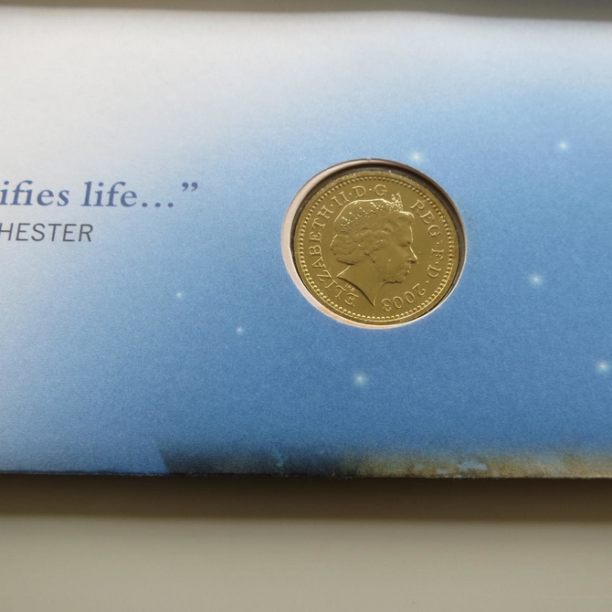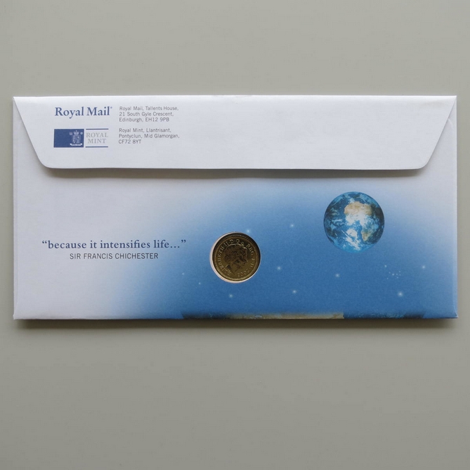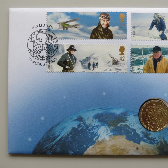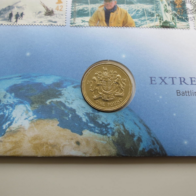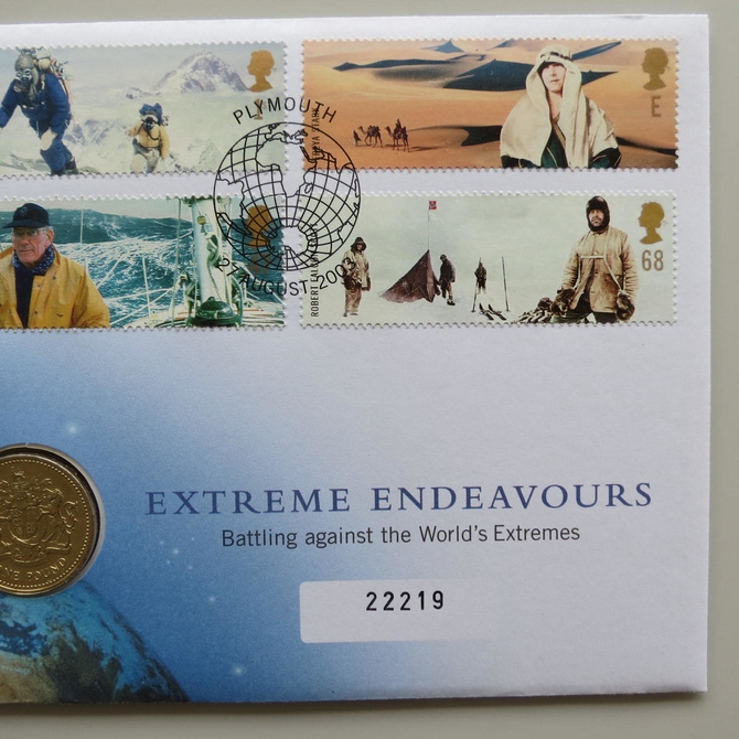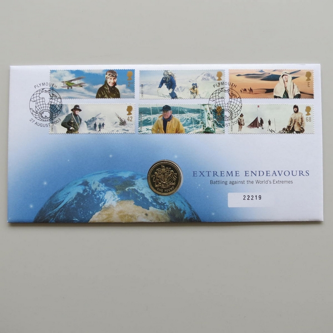 This 2003 Extreme Endeavours 1 pound coin cover is a Royal Mail first day cover. It celebrates efforts battling against the world's extremes and features a brilliant uncirculated 1 pound coin and a set of six Royal Mail commemorative stamps illustrating people who endured extreme challenges to succeed. Postmark cancelled Plymouth 27th August 2003.