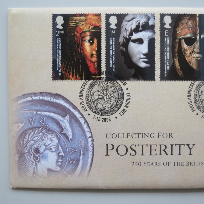 This 2003 Posterity 250th anniversary of British Museum London medal cover is a Royal Mail first day cover. It celebrates 250 years of the London Museum and features a medal and a set of six Royal Mail commemorative stamps. Postmark cancelled 250th Anniversary British Museum London WC1 7th October 2003.