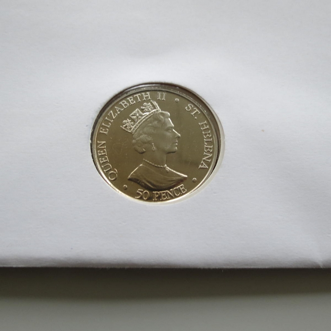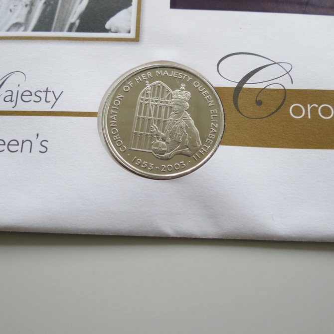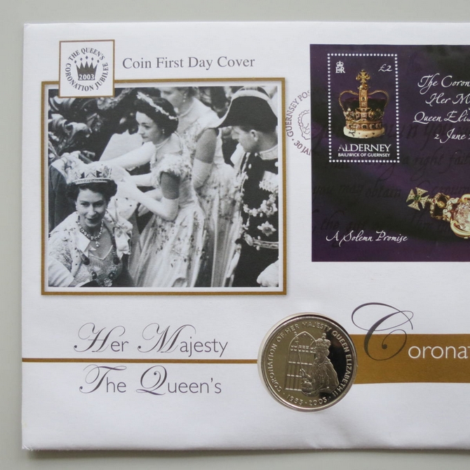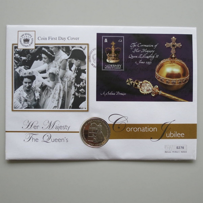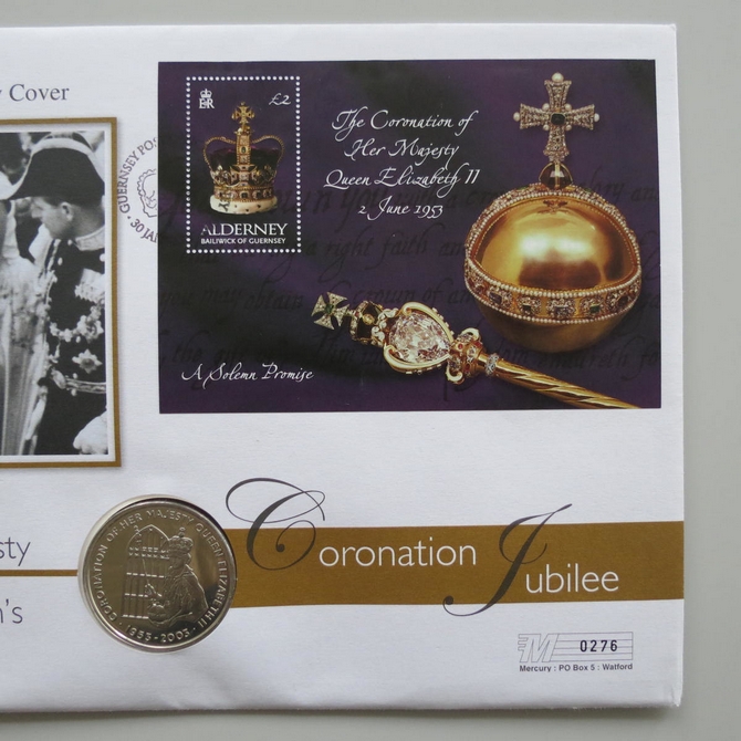 This 2003 Queen's Coronation Jubilee BU 50p pence coin cover is issued by Alderney as PNC first day covers. It hosts a brilliant uncirculated fifty pence coin by St Helena and a stamp marking HM Queen Elizabeth II's 50 years of Coronation. Cancelled postmark Guernsey Post Office 30th January 2003.