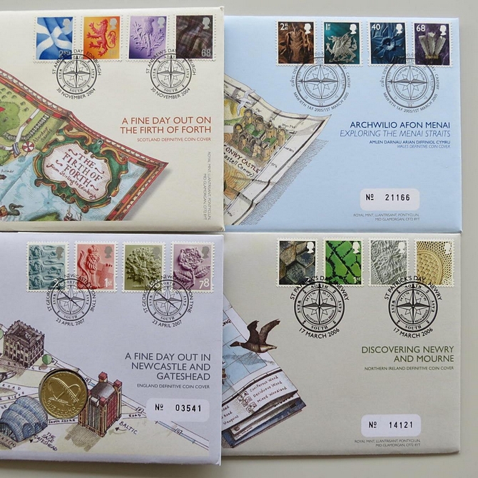 These 2004 - 2007 Patron Saints Day 1 pound coin covers are a first day cover set by the Royal Mail. They commemorate the patron saint day of Scotland, Wales, Northern Ireland and England and hosts brilliant uncirculated one pound coin and Royal Mail stamps. The covers celebrate St. Andrew's Day (Scotland), St. David's Day (Wales), St. Patrick's Day (Northern Ireland) and St. George's Day (England). Postmark cancelled on each St. Patron day of the nation.