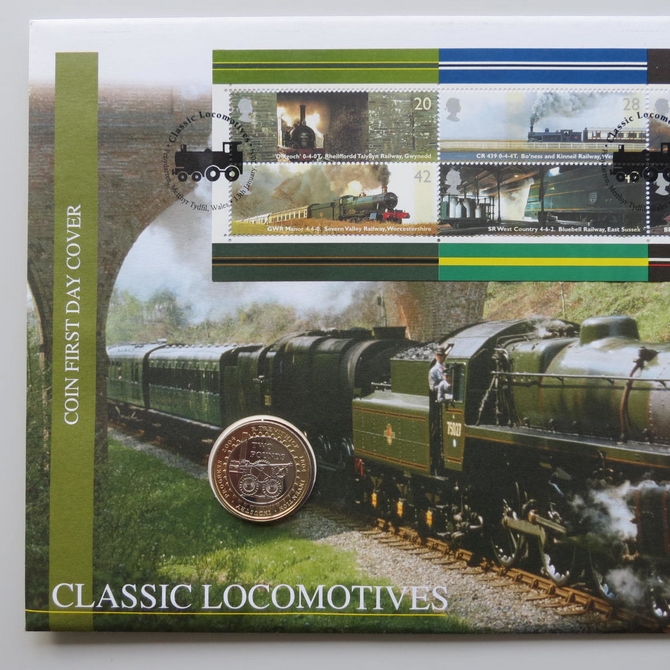 This 2004 Classic Locomotives 2 pounds coin cover is issued by UK as PNC First Day Covers. It hosts a brilliant uncirculated two pounds coin by the Royal Mint and Royal Mail stamps commemorating the classic steam locomotives. The coin features the Trevithick's Penydarren first steam locomotive and the stamps depicts many of the iconic steam powered trains. Postmark cancelled Classic Locomotives Penydarren Merthyr Tydfil Wales 13th January 2004.