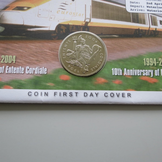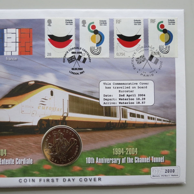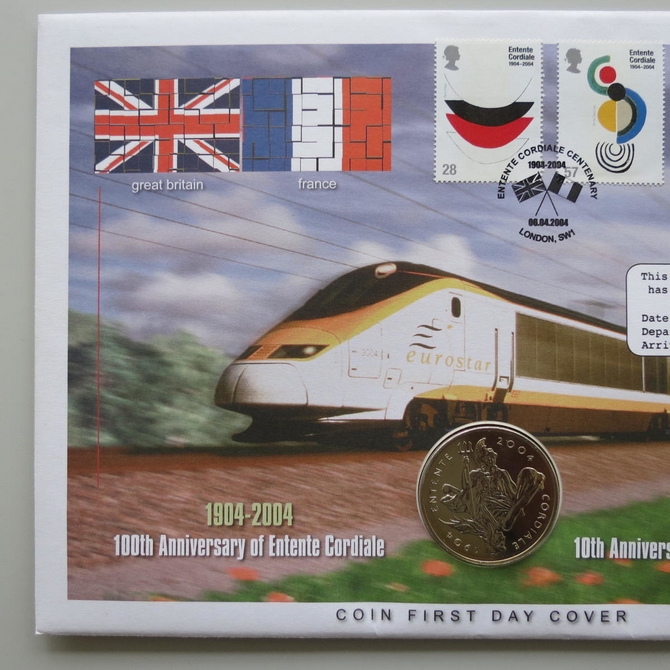 This 2004 Entente Cordiale 100th anniversary 5 pounds coin cover is issued by UK as PNC First Day Covers. It marks the 10th anniversary of the Channel Tunnel and hosts a BU five pounds coin and UK Royal Mail & French stamps. Cancelled postmark Entente Cordiale Centenary London SW1 6th April 2004.