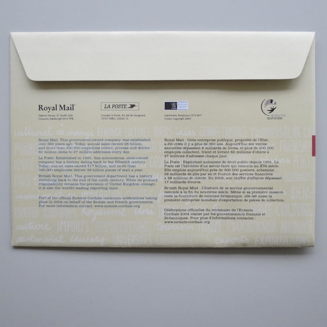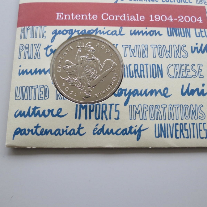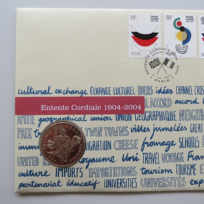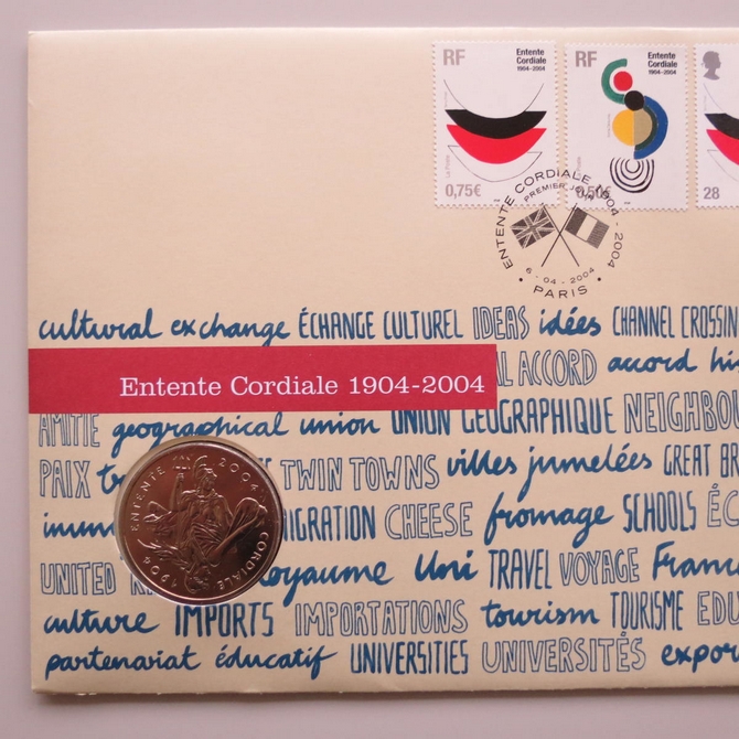 This 2004 Entente Cordiale 100th anniversary 5 pounds coin cover is a Royal Mail first day cover. It commemorates 100 years of Entente Cordiale and hosts a brilliant uncirculated 5 pounds coin and four special commemorative stamps. Cancelled postmark Entente Cordiale 1904 - 2004 Paris and London 6th April 2004.