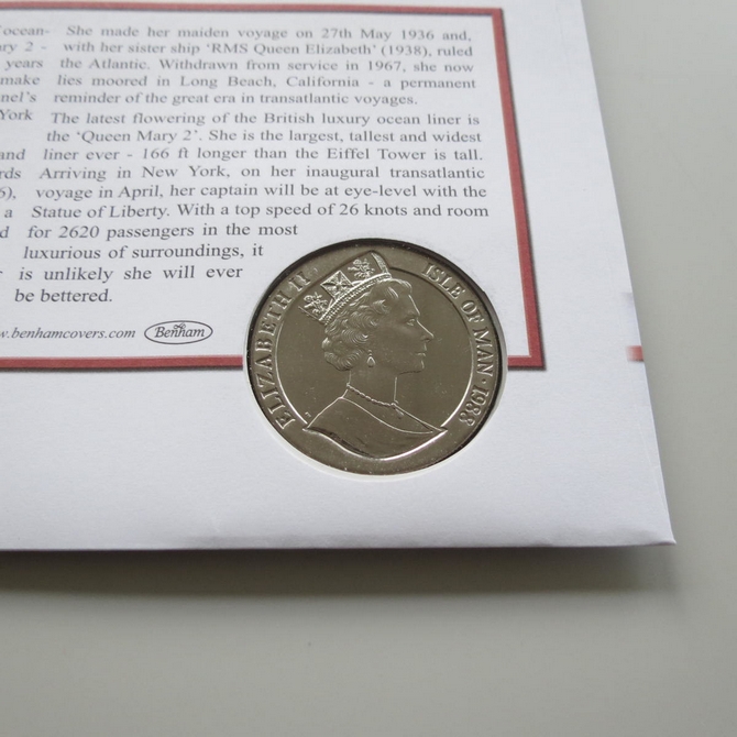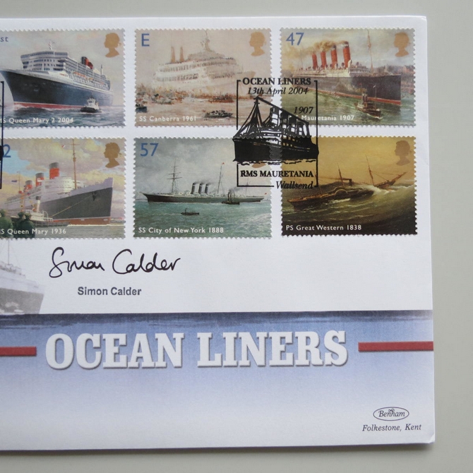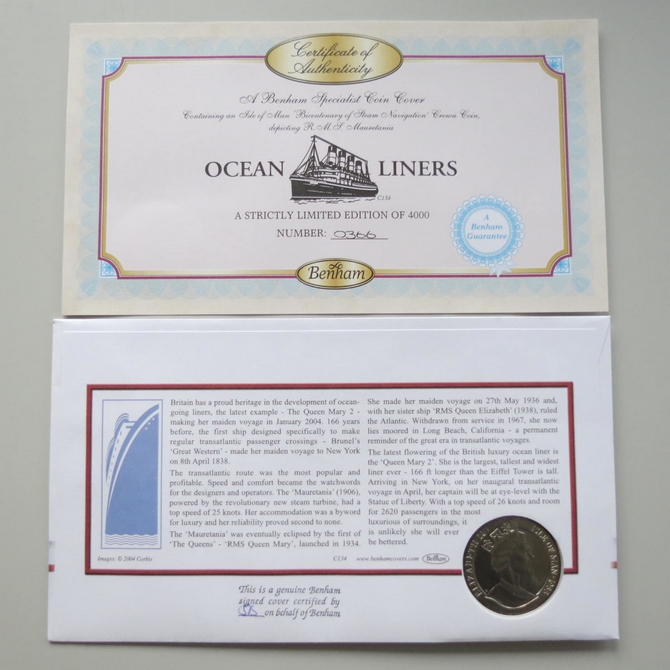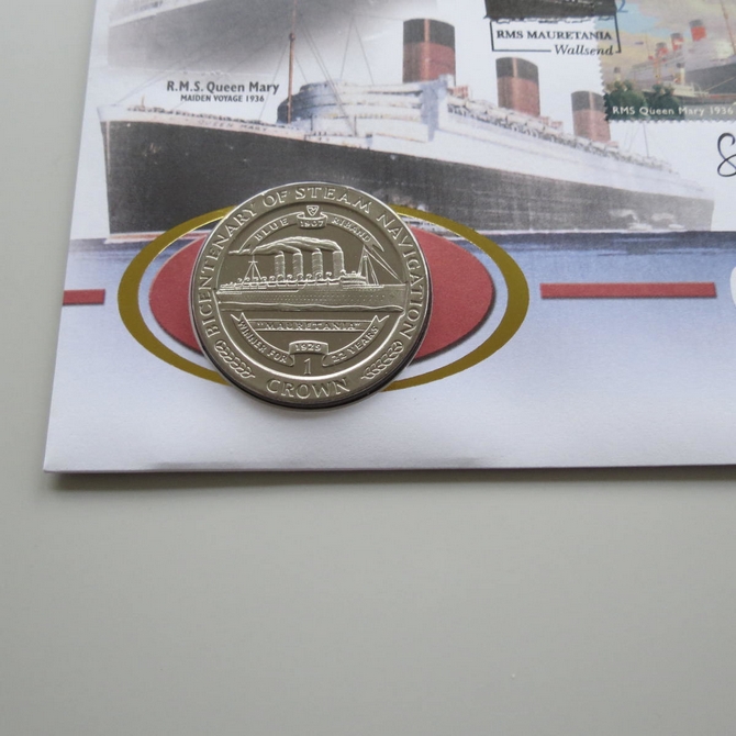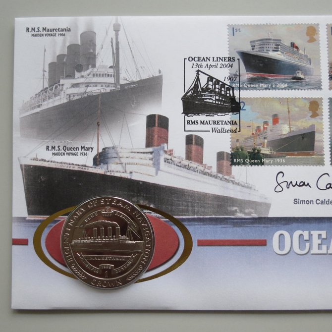 This 2004 Ocean Liners 1 Crown coin cover celebrates the bicentenary of Steam Navigation. The Benham first day cover hosts a brilliant uncirculated Isle of Man one crown coin depicting the Ocean Liner RMS Mauretania. The cover is hand signed by Simon Calder and features six stamps of historical ocean going liners. Cancelled postmark Ocean Liners RMS Mauretania Wallsend 13th April 2004.