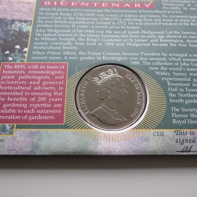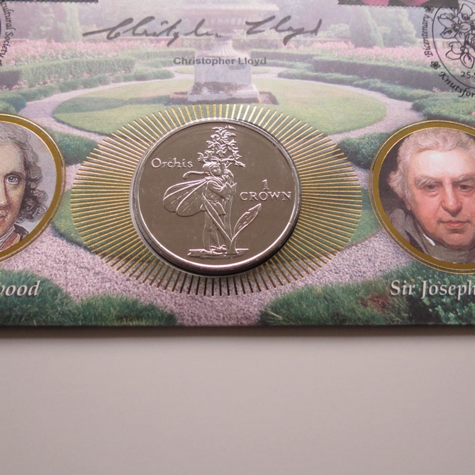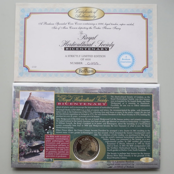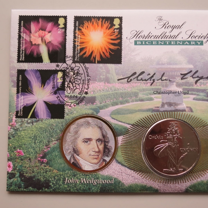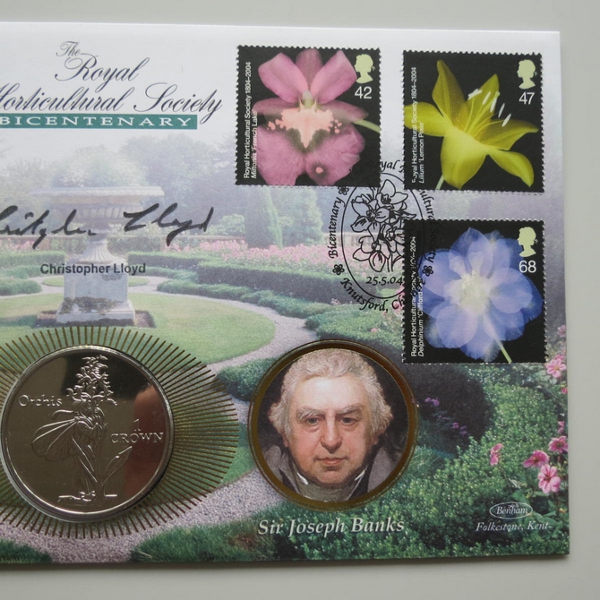 This 2004 Royal Horticultural Society bicentenary crown coin cover is a Benham first day cover. It celebrates 200 years of the RHS and hosts a brilliant uncirculated Isle of Man one crown coin depicting the Orchis flower fairy. Six Royal Mail stamps depict flowers. Hand signed by Christopher Lloyd. Cancelled postmark Bicentenary The Royal Horticultural Society Knutsford Cheshire 25th May 2004.
