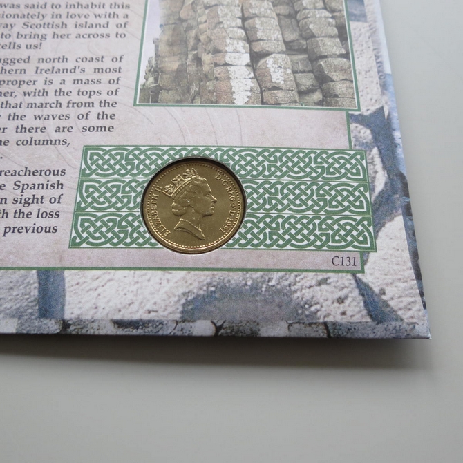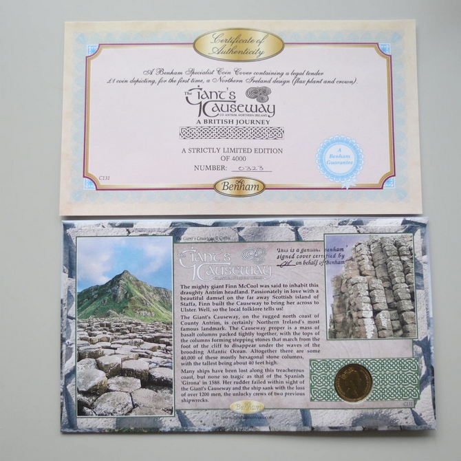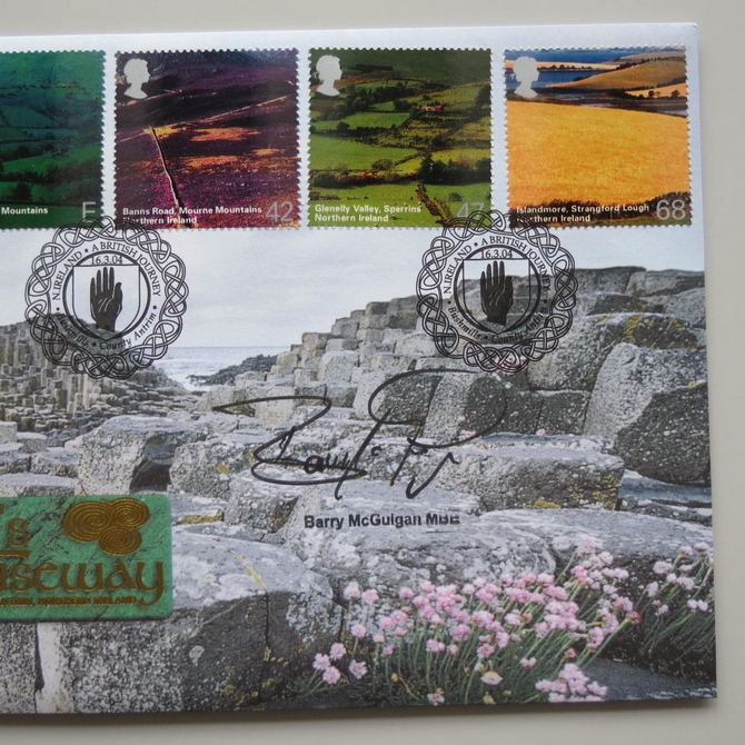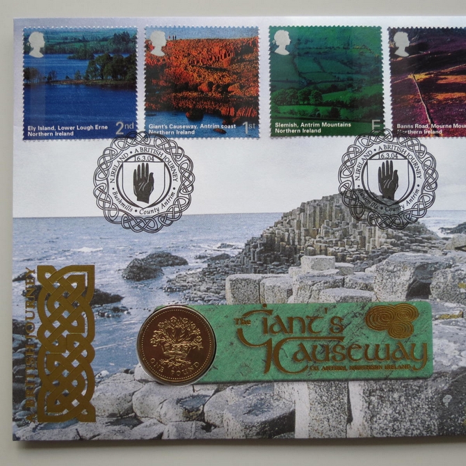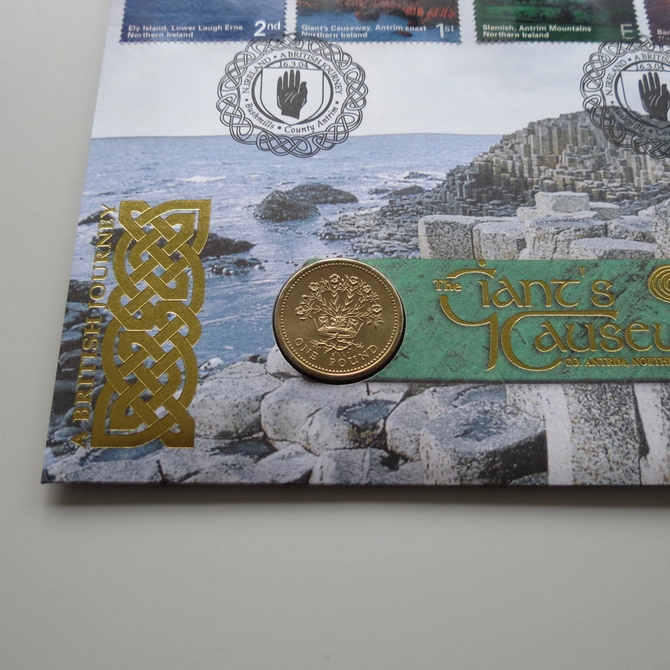 This 2004 The Giant's Causeway 1 pound coin cover celebrates Northern Ireland's Giant's Causeway in Co. Antrim. The Benham first day cover is signed by Barry McGuigan and features a one pound coin. Titled A British Journey, the cover hosts six stamps showing different regions of Northern Ireland. Cancelled postmark Northern Ireland A British Journey Bushmills County Antrim 16th March 2004.