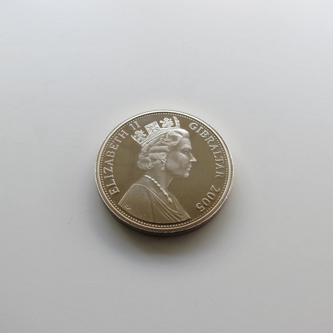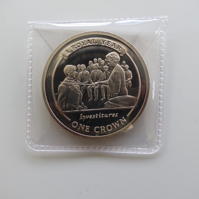 This 2005 A Royal Year brilliant uncirculated 1 Crown coin is issued by Gibraltar. It shows Her Majesty Queen Elizabeth II carrying out the Investitures Ceremony, Knighting a person who is being honoured. The coin is presented in a clear plastic sleeve.