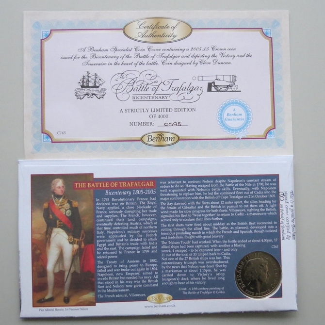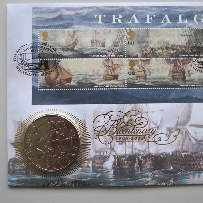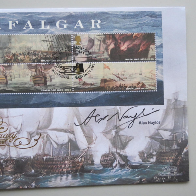 This 2005 Battle of Trafalgar bicentenary 5 pounds coin cover is a Benham first day cover. It commemorates 200 years of Nelson's Battle of Trafalgar and hosts a 5 pounds coin and Royal Mail stamps. FDC is hand signed by Alex Naylor, a expert historian on Napoleonic Wars and in particular the Nelsonian Navy. Cancelled postmark The Battle of Trafalgar Bicentenary Whitehall London SW1 18th October 2005.