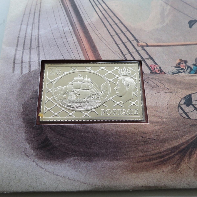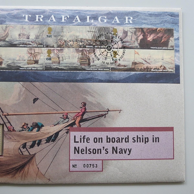 This 2005 Battle of Trafalgar silver ingot postage stamp cover is a Royal Mail first day cover. It commemorates the Battle of Trafalgar bicentenary and hosts a sterling silver ingot and Royal Mail stamps. Cancelled postmark Burnham Thorpe King's Lynn Norfolk 18th October 2005.