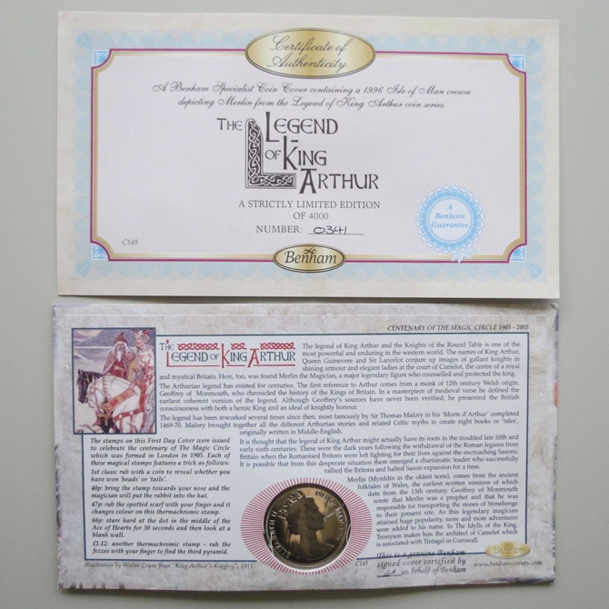 This 2005 Centenary of The Magic Circle 1 Crown coin cover is issued by Benham as Signed UK PNC First Day Covers. It hosts an Isle of Man one Crown coin and Royal Mail stamps. The FDC is hand signed by Cherie Lunghi. Postmark canceleed dated 15th March 2005.