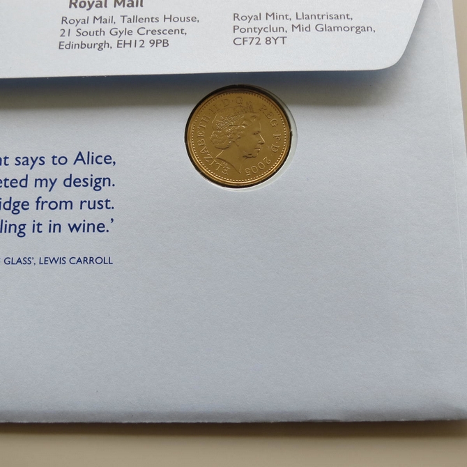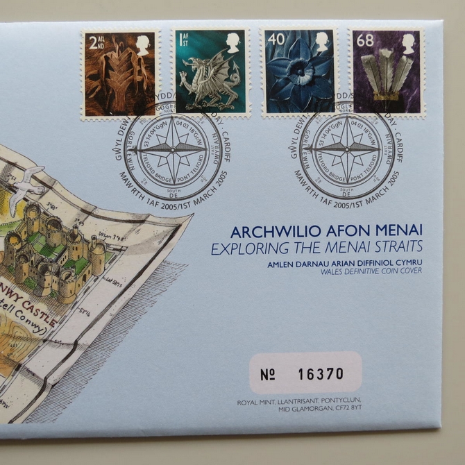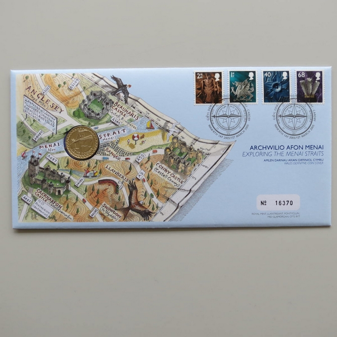 This 2005 Exploring Menai Straits 1 pound coin cover is a Royal Mail first day cover released on St. David's Day. It hosts a brilliant uncirculated Welsh 1 pound coin by the Royal Mint and four Royal Mail stamps showing definitive emblems of the nation of Wales. Menai Straits is a stretch of shallow water which separates the island of Anglesey and mainland Wales. Cancelled postmark St. Davids Day Cardiff 1st March 2005.