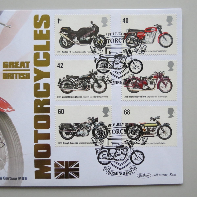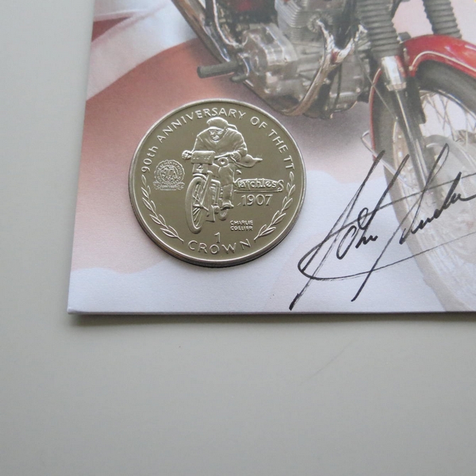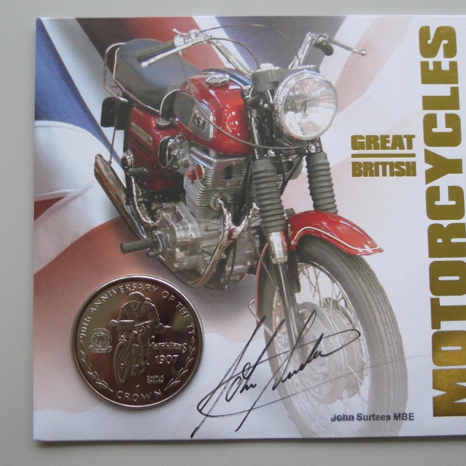 This 2005 Great British Motorcycles Crown coin cover is issued by Benham as UK PNC First Day Covers. It hosts a brilliant uncirculated one Crown coin and Royal Mail stamps. FDC hand signed by John Surtees. Postmark cancelled dated 19th July 2005.