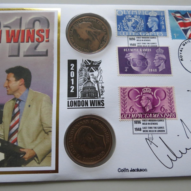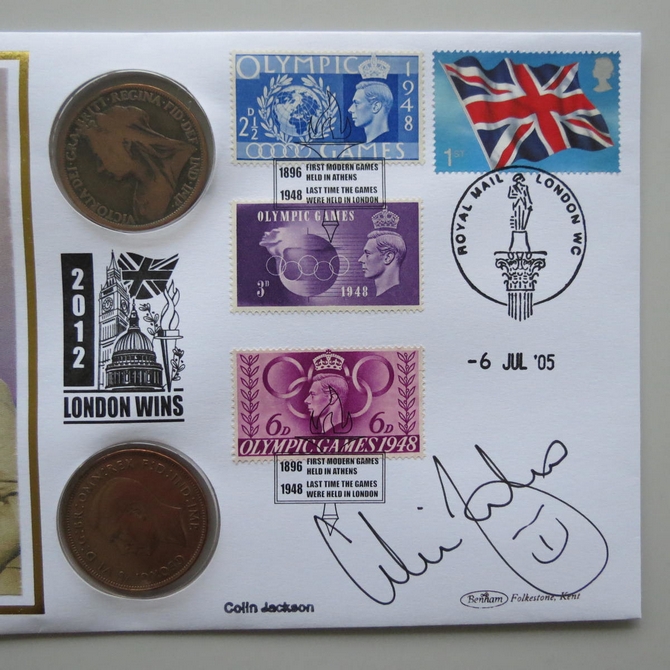 This 2005 London Wins 2012 pennies coin cover is issued by Benham as Signed UK PNC First Day Covers. It hosts 2 historic pennies associated with the modern Olympic Games and Royal Mail stamps. FDC hand signed by Colin Jackson. Postmark cancelled dated 6th July 2005.