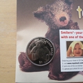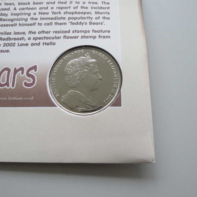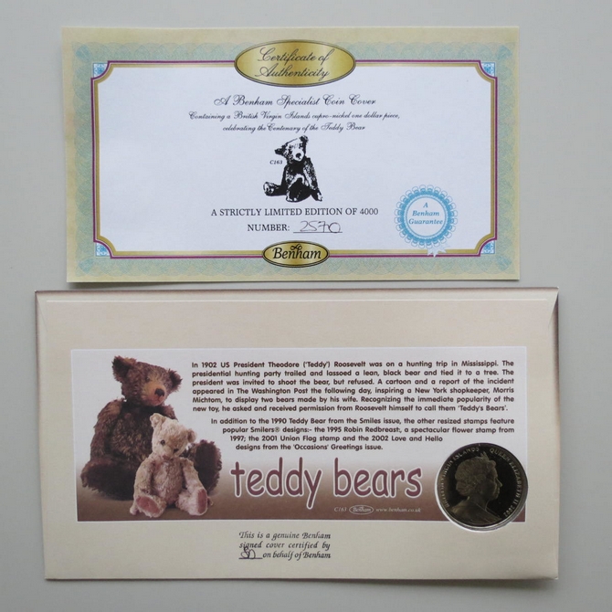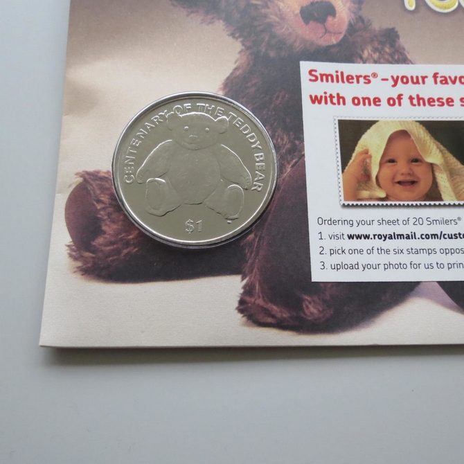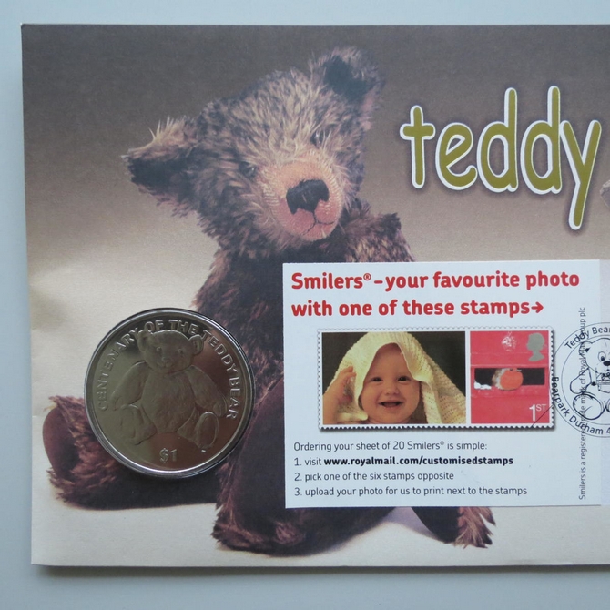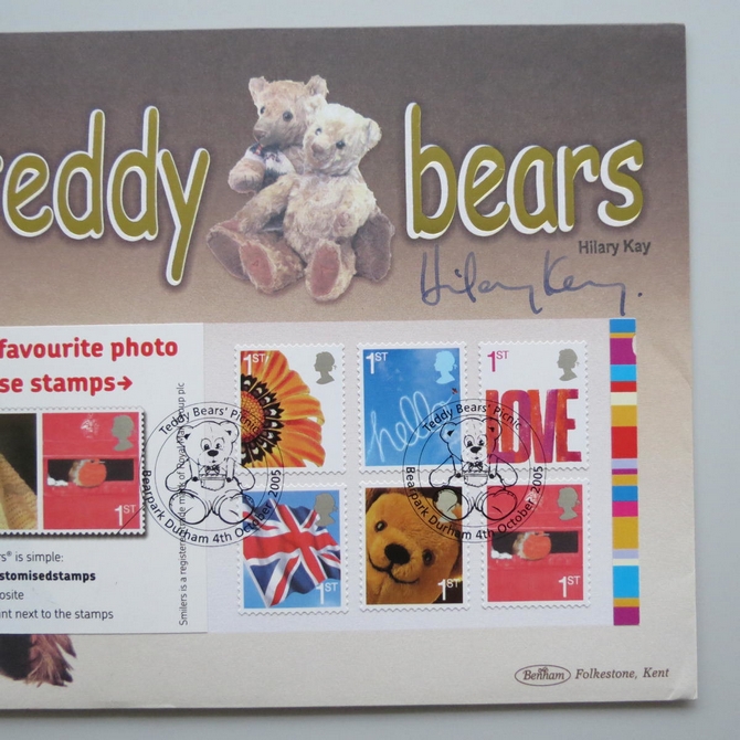 This 2005 Teddy Bears centenary 1 dollar coin cover is a Benham first day cover. It celebrates the 100 years of the teddy bear and hosts a brilliant uncirculated one dollar coin and Royal Mail stamps. FDC hand signed by Hilary Kay, a British antiques expert on toys and dolls. Cancelled postmark Teddy Bears Picnic Bearpark Durham 4th October 2005.