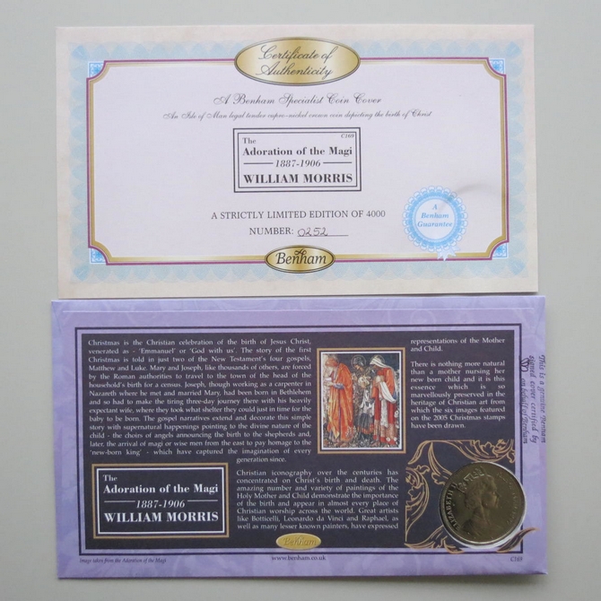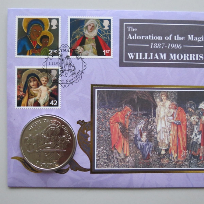 This 2005 The Adoration of the Magi 1887 - 1906 William Morris Crown coin cover is issued by Benham as Signed UK PNC First Day Covers. It hosts a brilliant uncirculated one Crown coin and Royal Mail stamps. FDC hand signed by Pam Rhodes. Postmark cancelled dated 1st November 2005.