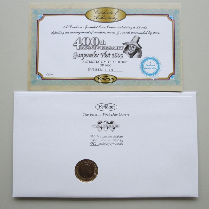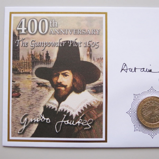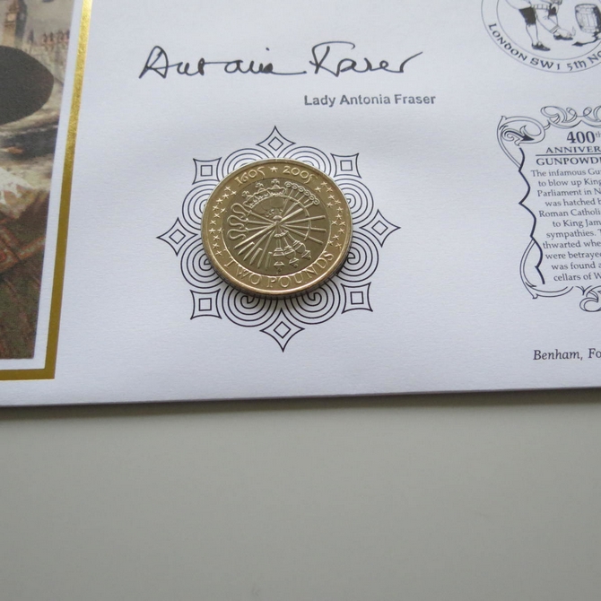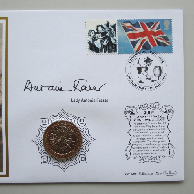 This 2005 The Gunpowder Plot 400th Anniversary 2 pounds coin cover is a Benham first day cover. It commemorates the 400th anniversary of the Gunpowder plot of 1605 and hosts a brilliant uncirculated two pounds coin by the Royal Mint and Royal Mail commemorative stamp showing Guy Fawkes. FDC hand signed by Lady Antonia Fraser. Cancelled postmark Gunpowder Plot 1605 London SW1 5th November 2005.