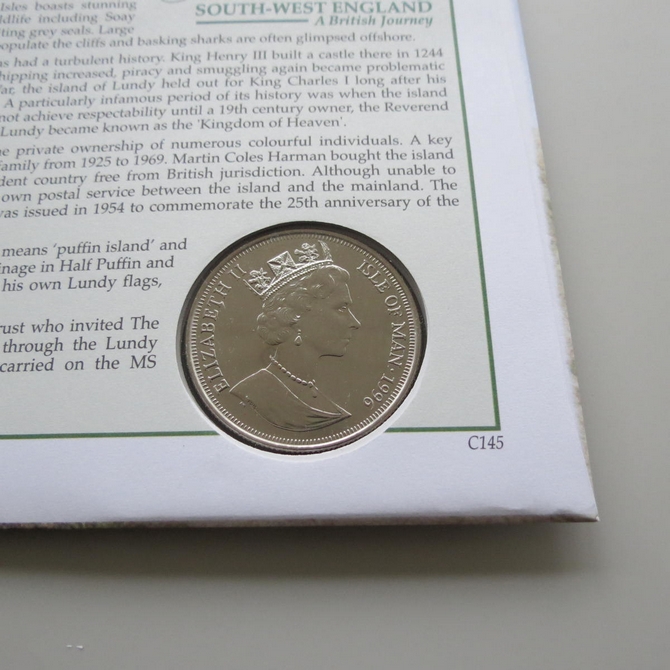 This 2005 The Island of Lundy Crown coin cover is issued by Benham as Signed UK PNC First Day Covers. It hosts a brilliant uncirculated one Crown coin and Royal Mail stamps featuring South West England. FDC is hand signed by Keith Shakleton. Postmark cancelled dated 8th February 2005.